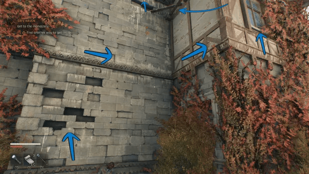 Заберись по стене справа от входа и продолжай карабкаться по белым секциям, как на изображении выше. Двигайся наверх, пока не окажешься на верхнем этаже монастыря.