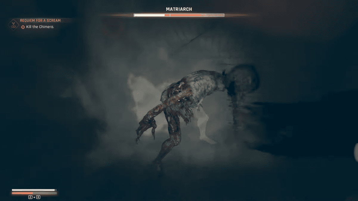 Спрыгнувший с потолка босс Матриарх тут же скроется в клубах дыма. Две его главных фишки — внезапные исчезновения и истошные вопли, призывающие бегунов. Каждый раз, когда Химера кричит, на экране появляется специальный индикатор, показывающий, насколько босс близко.