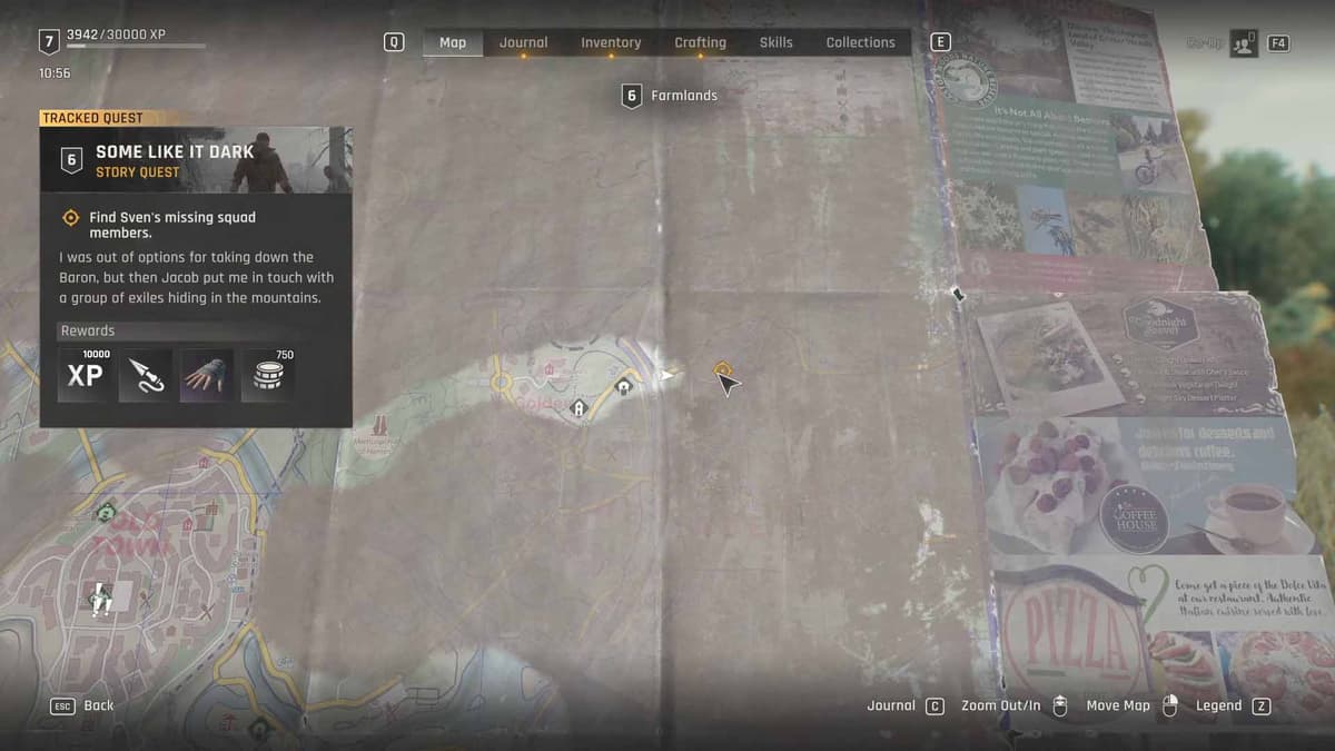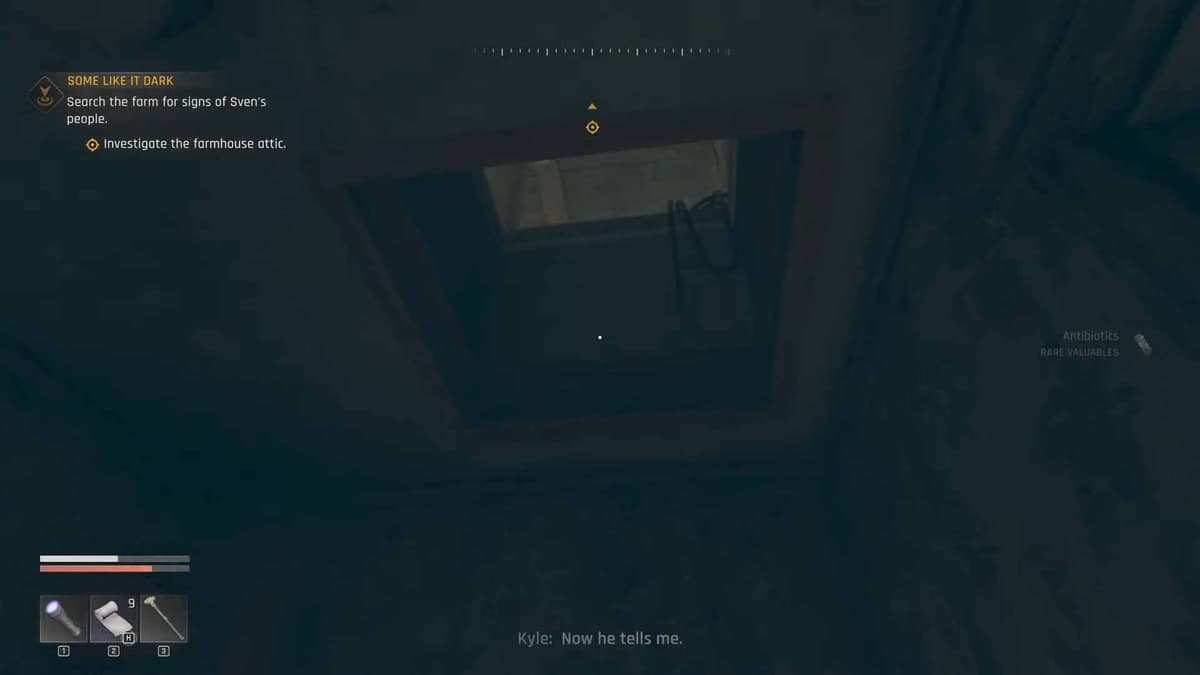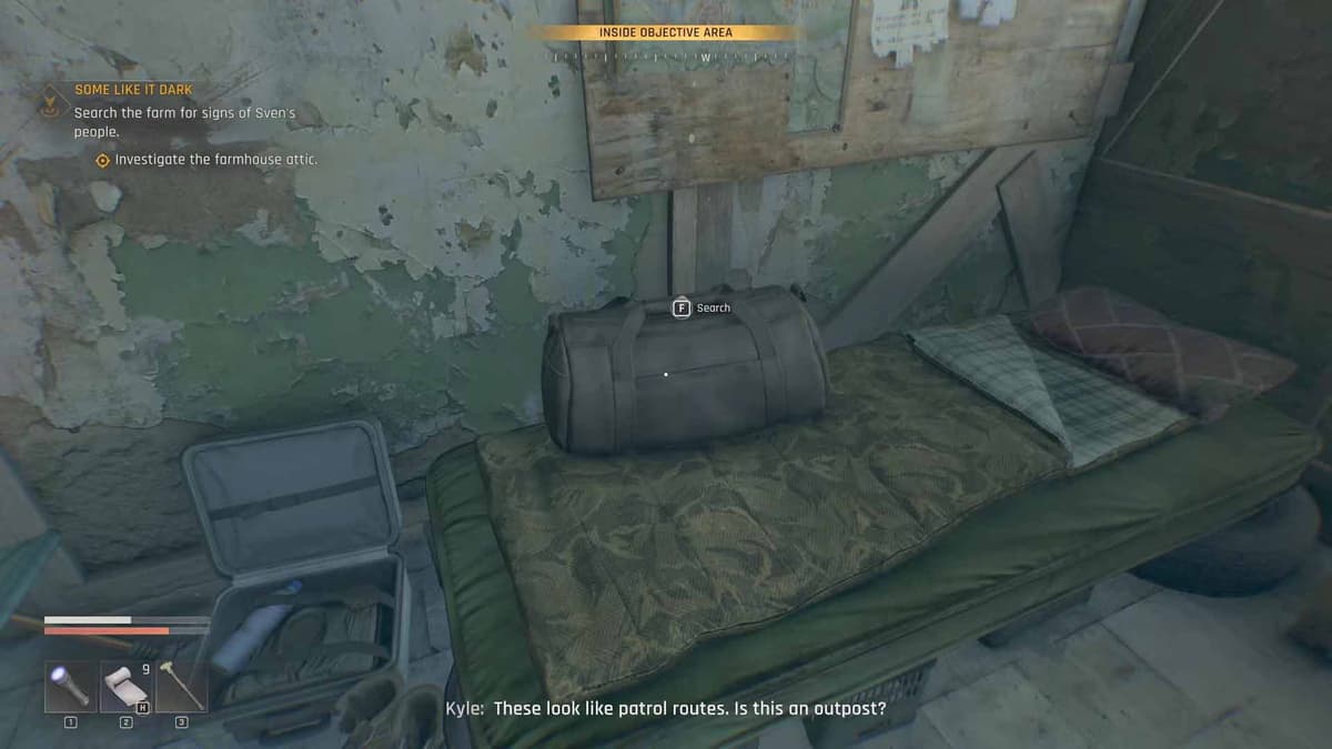 Следов там не окажется, и Свен сообщит, что парни часто прятались на чердаке. Поднимись туда и найди карту с пометкой аванпоста — это последнее известное местонахождение пропавших.