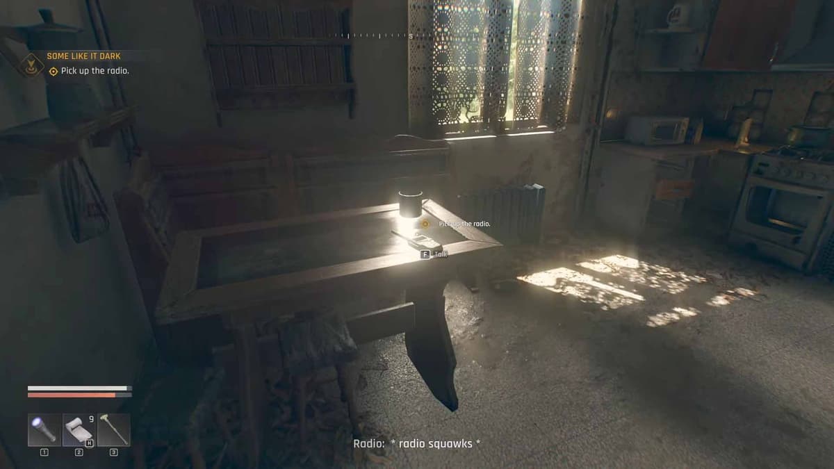 После зачистки области услышь шум рации в доме. Прими сообщение, чтобы узнать, где держат заложников.