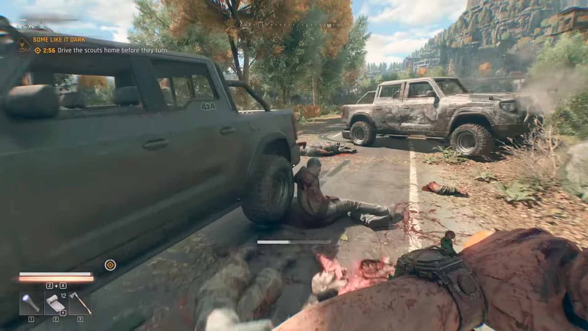 Добравшись до места, убей солдат и заражённых. Затем запрыгивай в грузовик — нужно отвезти разведчиков к Пещере Изгнанников. При этом время ограничено — запустится таймер на 3 минуты.