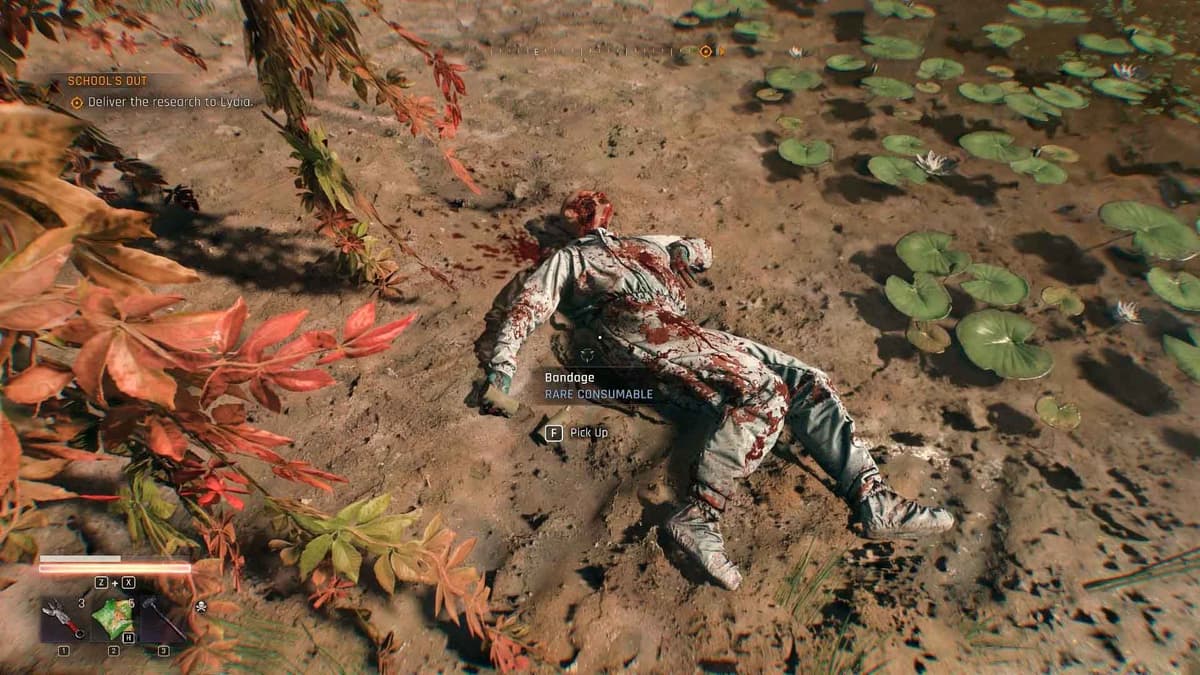 Иди по следам и кровяной тропе сквозь болото. Тут почти гарантированно встретишь двух заражённых (иногда всплывает третий, если шаришься глубже). След приводит к ещё одному солдату, свесившемуся с сломленного дерева над водой. Включай «Чутьё выжившего»: точка назначения — остров впереди, слева на берегу торчит разбитый автобус.