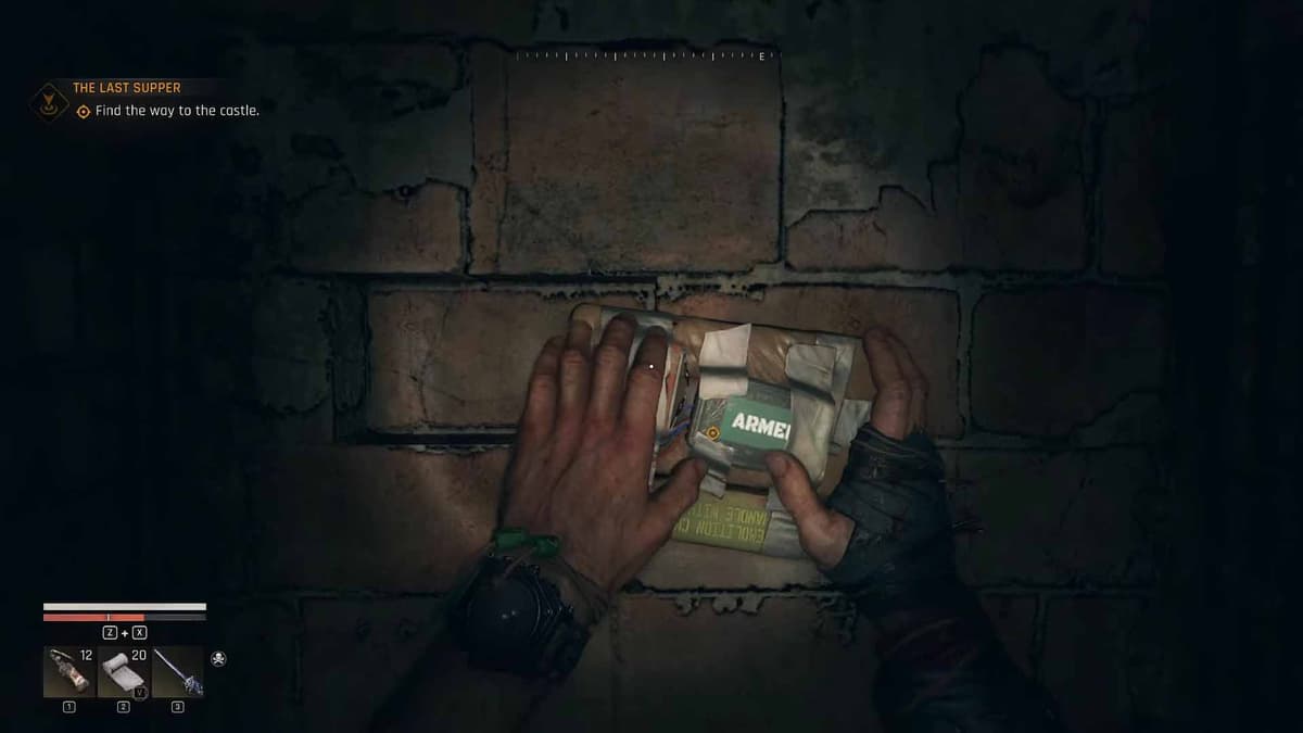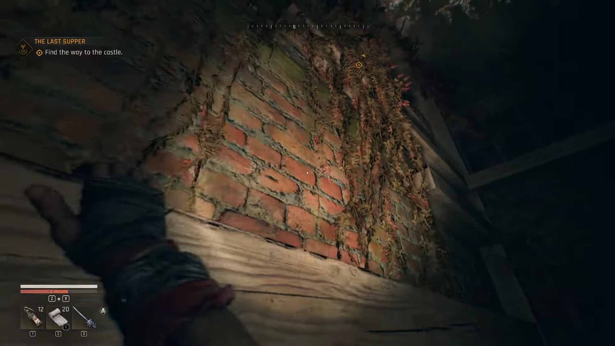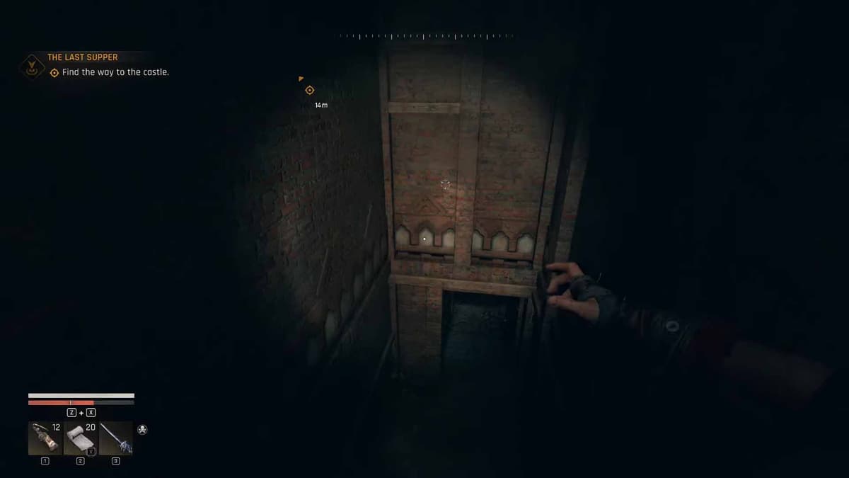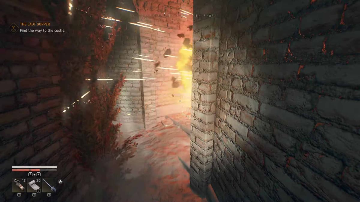 Наверху сверни налево — пройдёшь ещё одну группу выступов и разрушенные кирпичные стены. Войдя в коридор, слева пробей деревянное ограждение. Дойдя до заколоченной двери, сверни направо и поставь вторую взрывчатку на кирпичную стену.