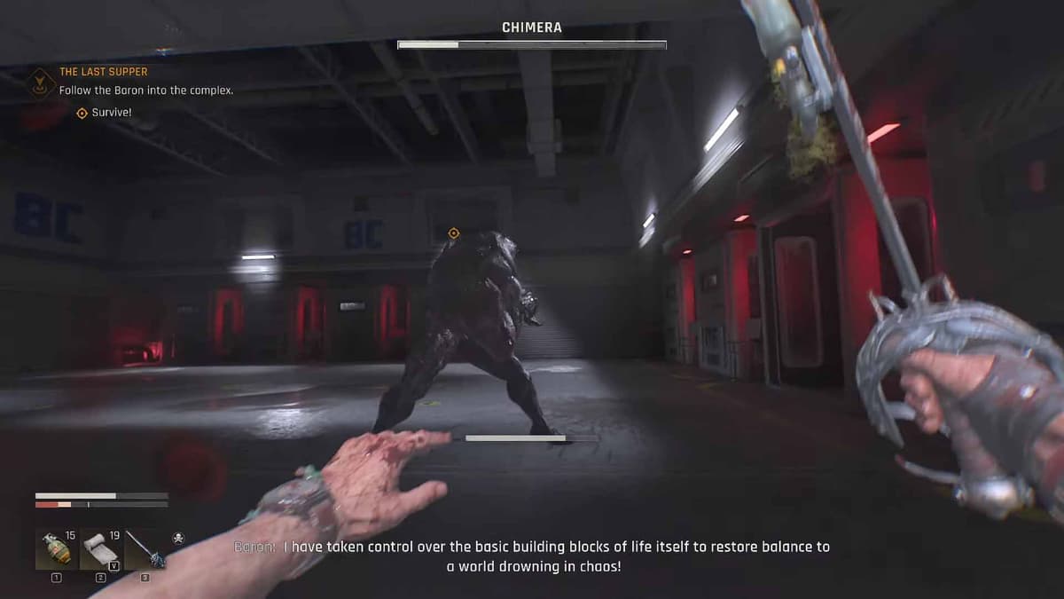 Третья фаза — Барон использует силу Зверя. Он быстр, силён и живуч, но тактика схожа с битвой против Химер: держи среднюю дистанцию, уворачивайся и бросай гранаты ему под ноги.