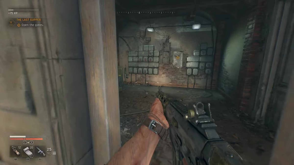 После убийства последнего снайпера иди к арке. В небольшой комнатке есть щиток питания ворот. Если рядом будут враги, то включить его не получится.