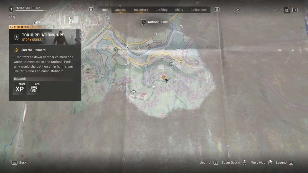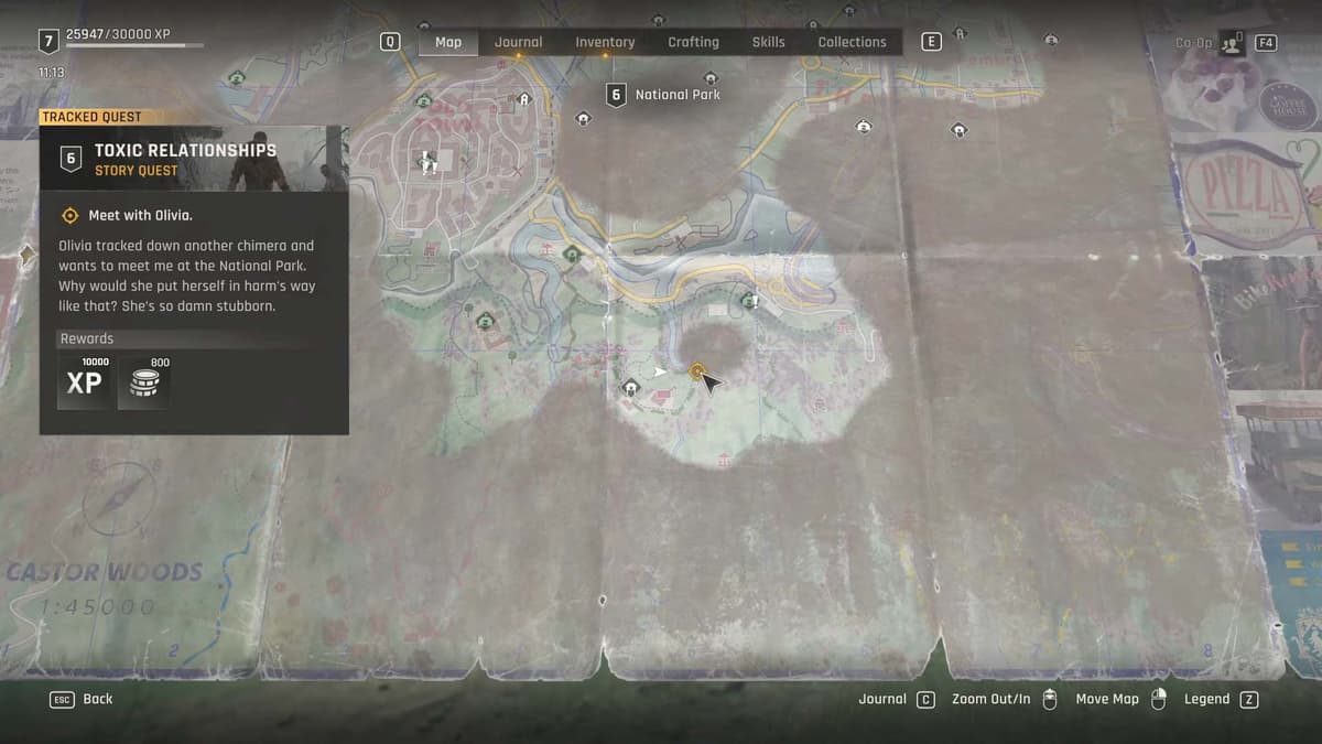 После квеста «Тайны в воздухе» (Secrets in the Air) в Dying Light: The Beast Оливия находит доказательства присутствия Химеры в Национальном парке и просит главного героя встретиться с ней, запуская тем самым миссию «Токсичные связи» (Toxic Relationships).