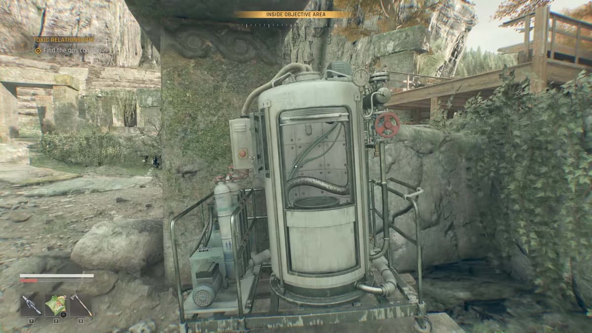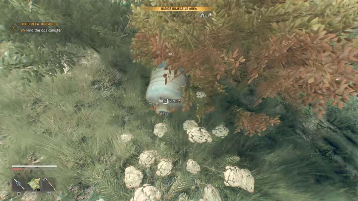 Изучи местность в поисках белого газового баллона атомайзера. Советуем просто развернуться на 180 градусов и пройти пару метров — он лежит в кустах. Используй Чувство Выжившего, чтобы подсветить предмет, если возникнут трудности.