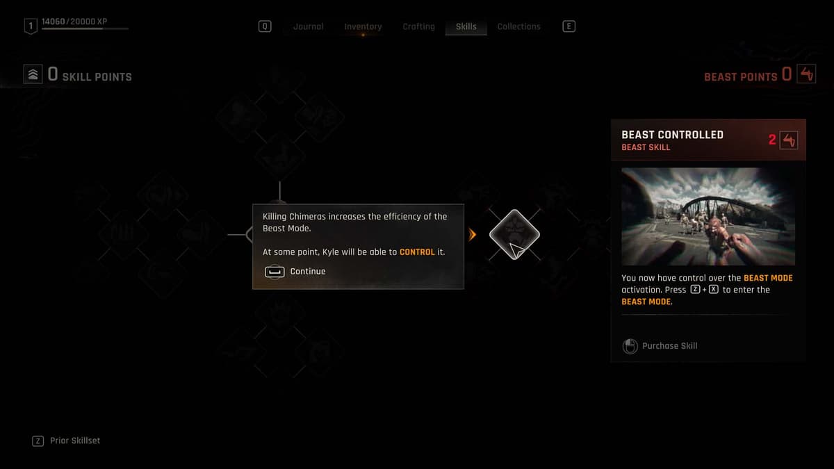 По мере игры ты собираешь Клетки Мутации (GSB) с поверженных Химер (Chimeras) и тратишь их на прокачку ветки режима. Добравшись до узла «Управляемый Зверь» (Beast Controlled), можно включать его вручную — нажатием обоих стиков L3 + R3 на консоли или комбинацией Z + X на клавиатуре. Позже, взяв скилл Апекс Хищник (Apex Predator), ты получишь возможность активировать режим ещё до полного заполнения шкалы.
