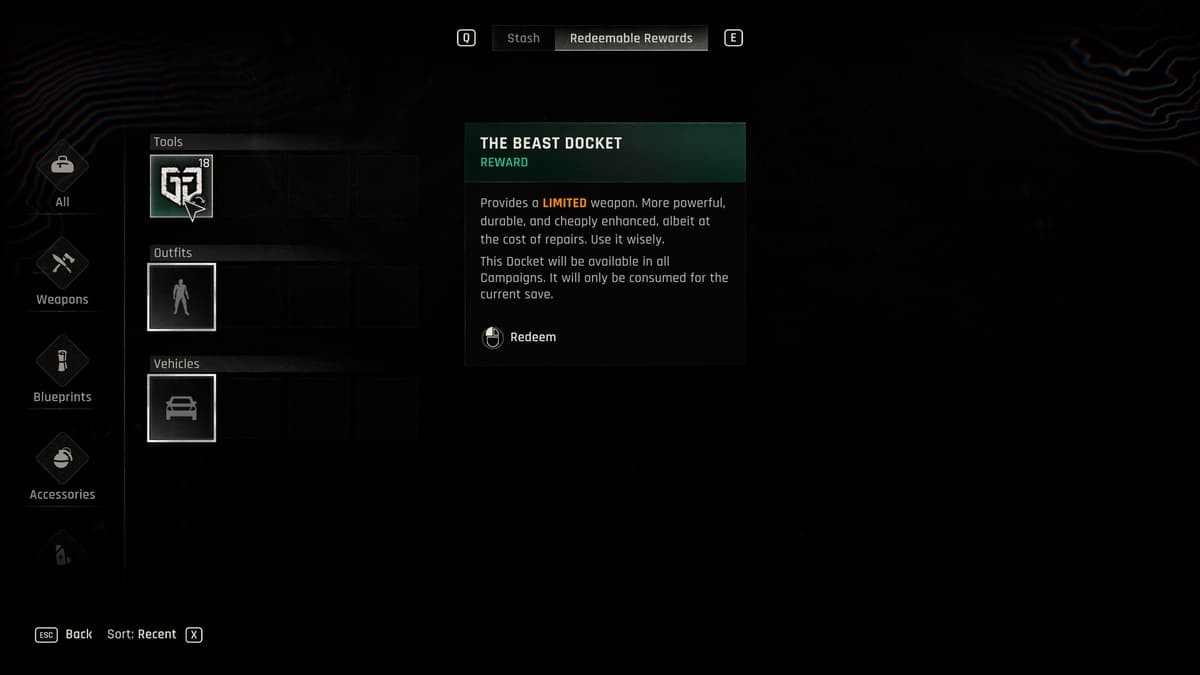 После «Пролога» и доступа к твоему тайнику в игре откроется вкладка «Вознаграждения» (Redeemable Rewards) — здесь и забираешь всё накопленное.