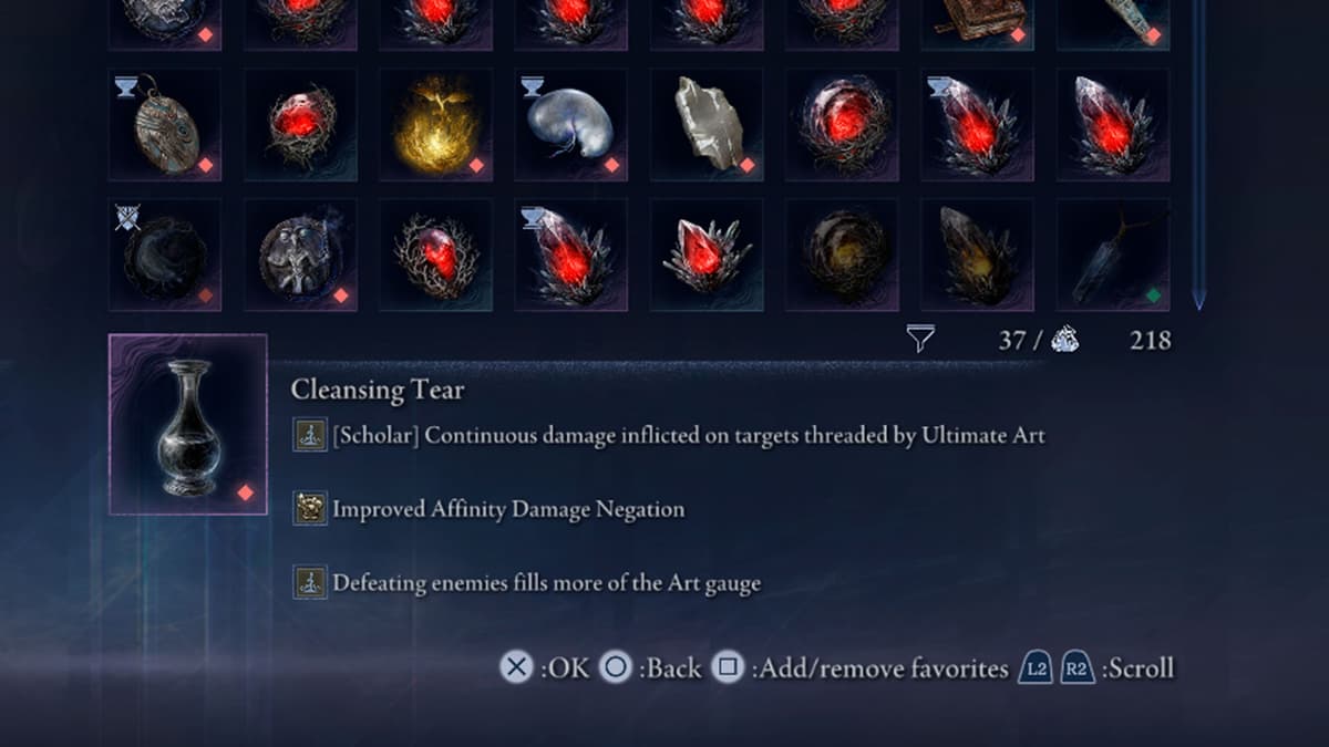 Очищающая слеза. Делает так, что ульта постоянно дамажит всех связанных врагов и быстрее заряжается, когда ты их добиваешь. Цепляешь пачку — она тает, а ульт уже почти готов снова.