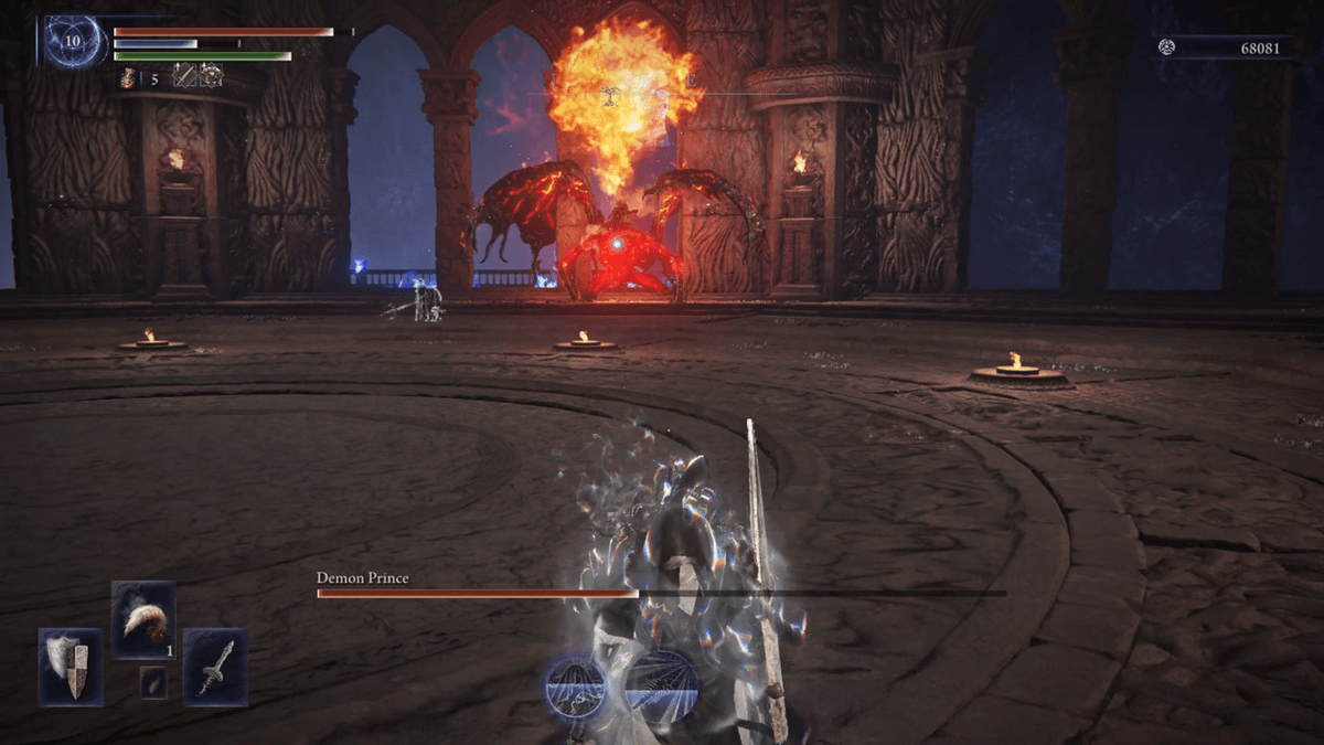 Если же до этого ты первым делом расправился с Демоном из глубин, то принц выстрелит в тебя гигантским огненным шаром, из которого в полёте вылетают шарики поменьше. Пока босс заряжает фаербол, можешь бить его изо всех сил, но потом беги и уворачивайся, чтобы создать дистанцию.