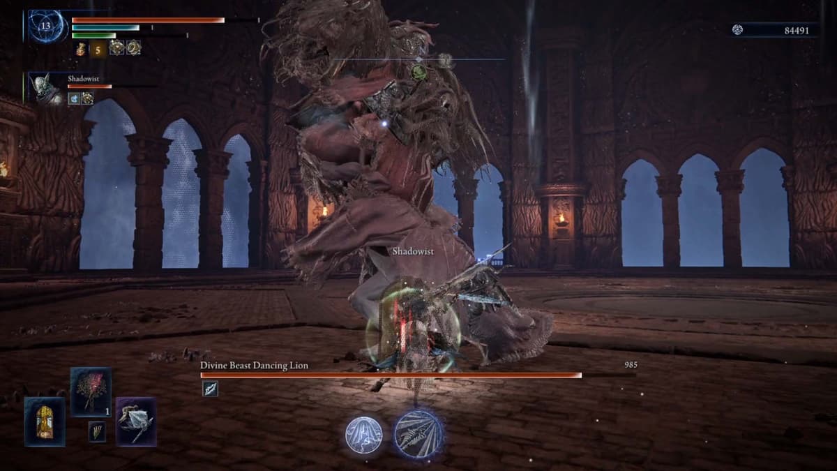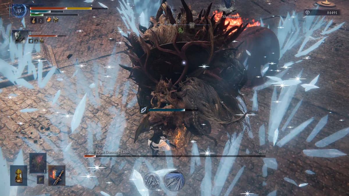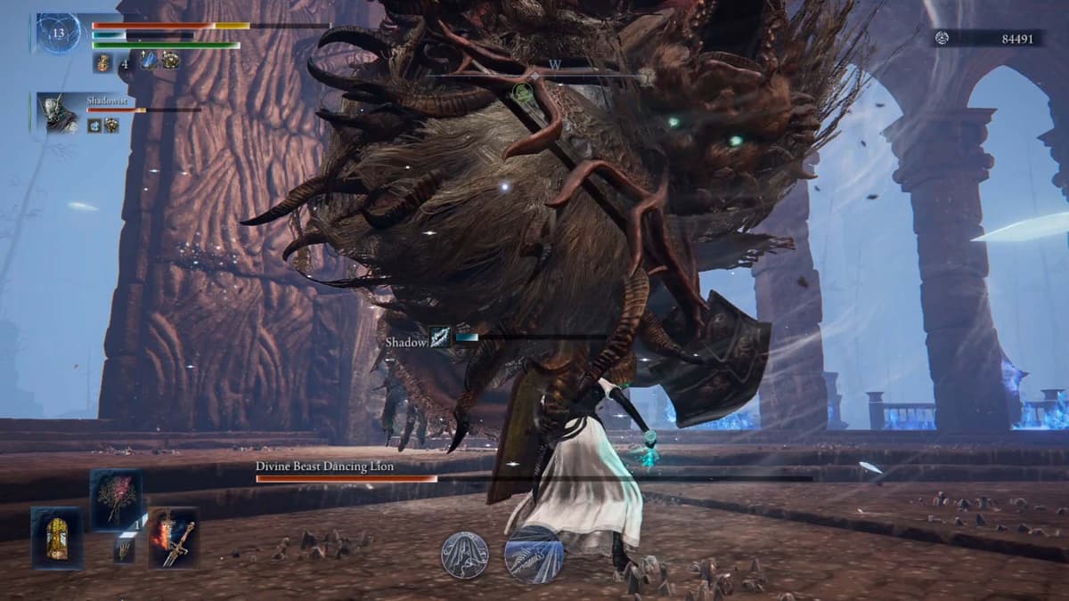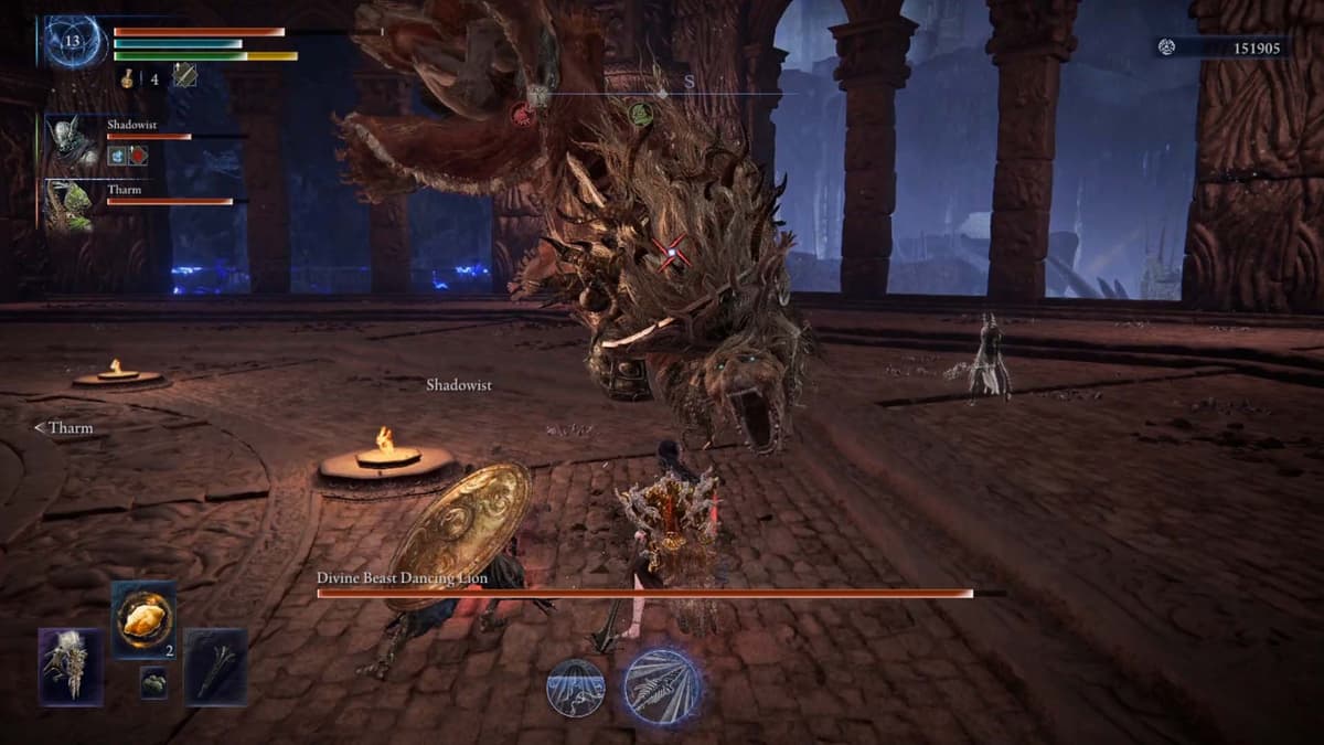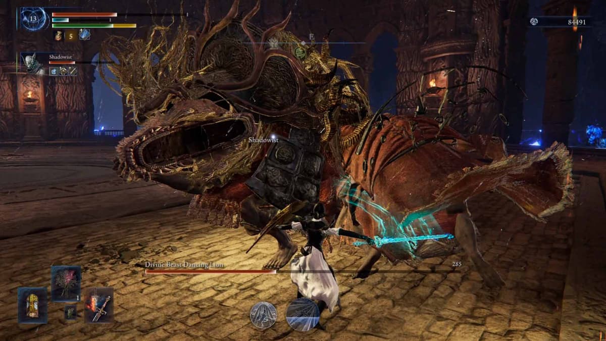 Священный танцующий лев — здоровенный зверь из дополнения Shadow of the Erdtree, который любит атаки с огромным радиусом и большущим уроном. Самая опасная зона — голова и пасть, так что чаще бей сбоку или по хвосту.