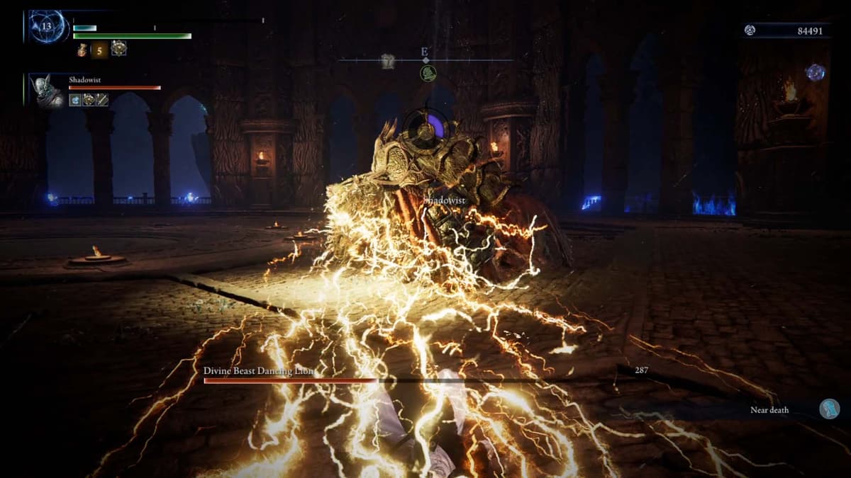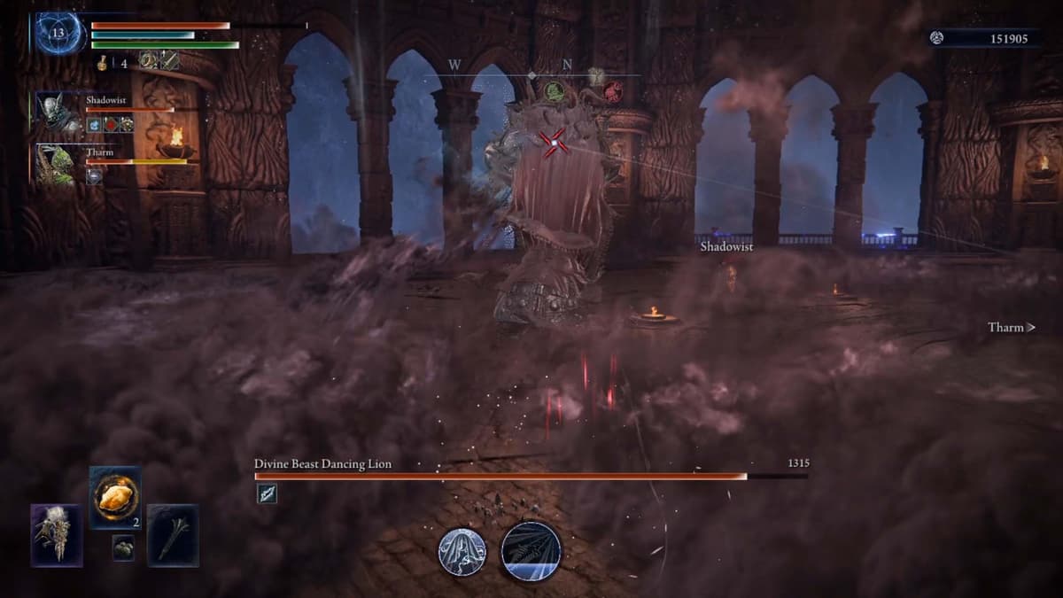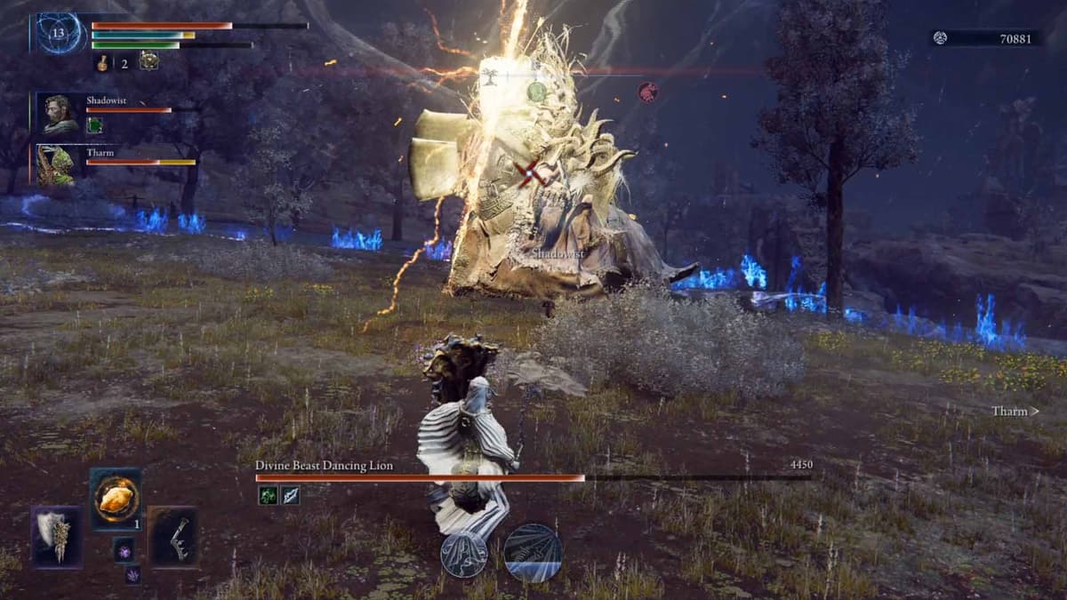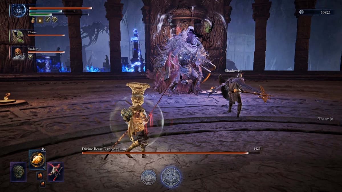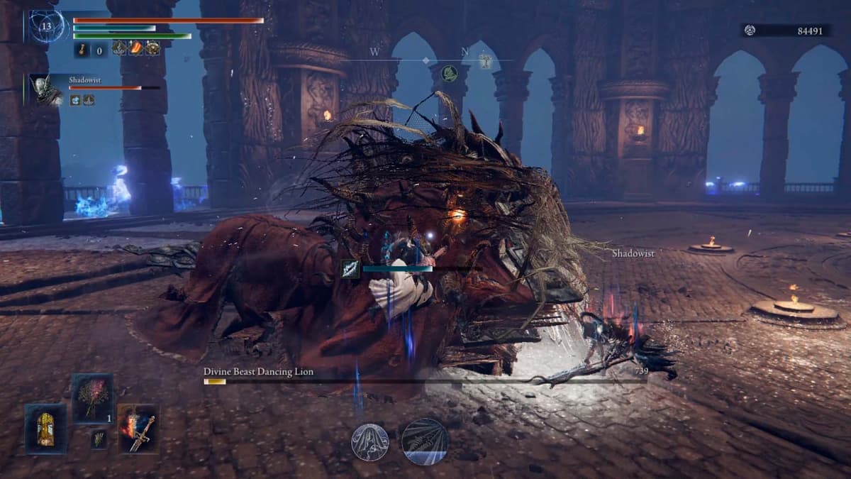 Священный танцующий лев — здоровенный зверь из дополнения Shadow of the Erdtree, который любит атаки с огромным радиусом и большущим уроном. Самая опасная зона — голова и пасть, так что чаще бей сбоку или по хвосту.