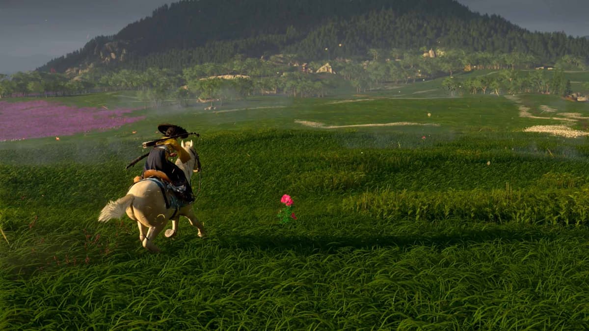 В полях с белыми цветами конь получает краткий ускоряющий эффект. Даже крошечные пятна работают – эффект тянется пару десятков метров. Прыжки через брёвна тоже увеличивают скорость. По пути подбирай бамбук, грибы и цветы – игра учитывает сбор «на галопе», а ритм движения почти не сбивается.