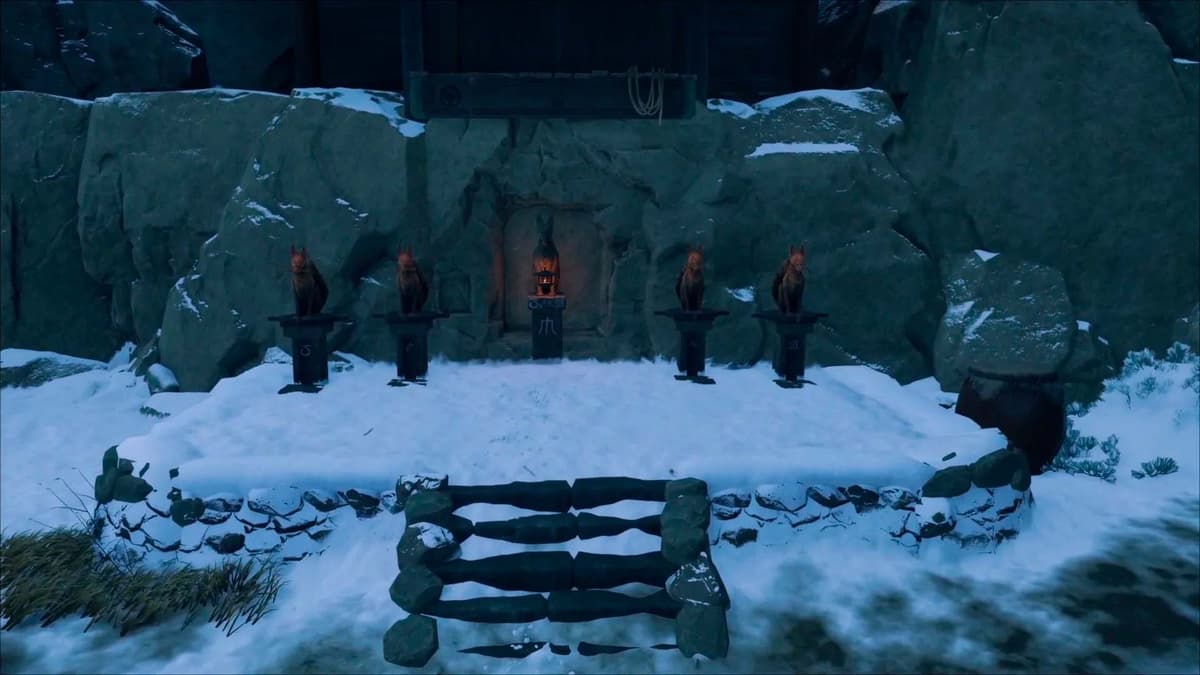 Рядом находится жаровня. Возьми оттуда горящий факел. Найди два фонаря по сторонам двери, на крышах которых сидят резные лисы. Зажги только их (остальные не трогай). Если всё сделано правильно, в стене между каменными лисами откроется потайной лаз. Пригнись и пролезай внутрь.