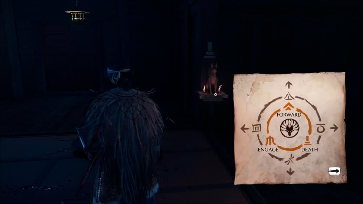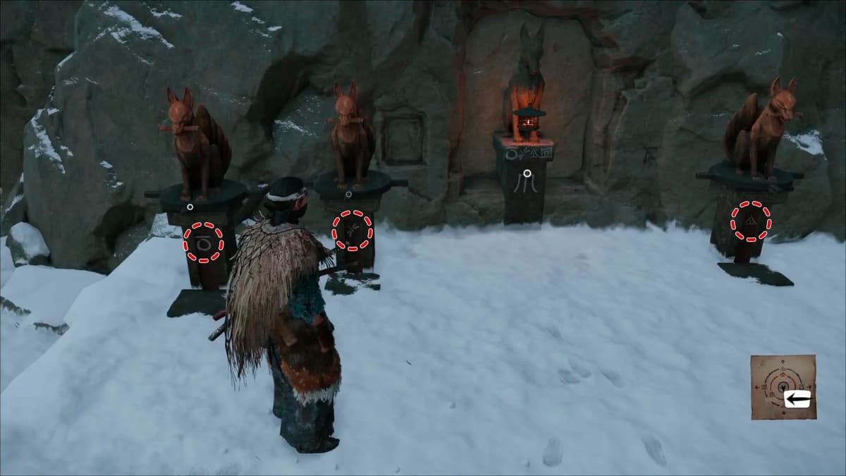 Теперь у тебя есть всё, чтобы решить головоломку с лисами. Возвращайся во двор (по пути отбей ещё атаку синоби). Под каждой лисой на постаменте виден символ направления. Нужно повернуть фигурки правильно.