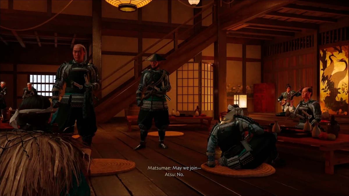 После сцены осмотрись: рядом с тобой стоит пустой столик с циновкой. Подойди к нему и нажми кнопку взаимодействия, чтобы усадить Ацу. Героиня заказывает саке, но не успевает она сделать глоток, как к ней тут же подкатывают двое самураев Мацумаэ. Мужчины навязываются «скрасить компанию», на что Ацу уверенно отвечает отказом.