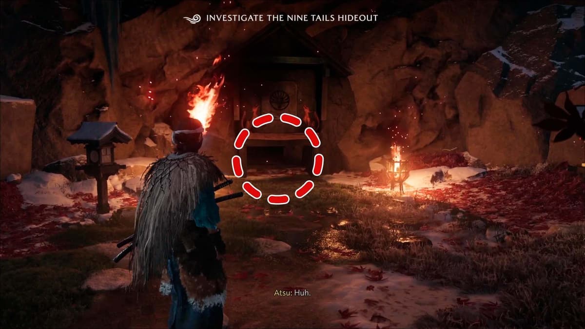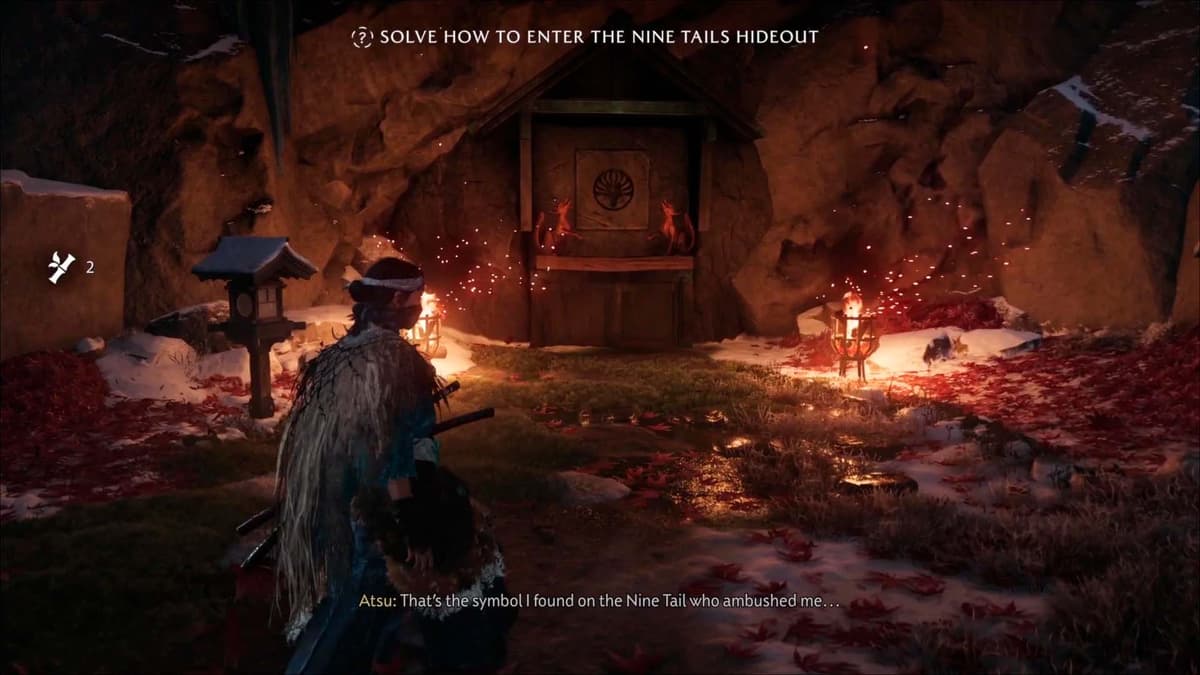 Осмотрись повнимательнее. По бокам двери горят факелы, а на стене вырезаны фигуры двух лисиц по сторонам символа Девяти Хвостов. Присмотрись: Ацу замечает, что эти статуи похожи на фигурки на фонарях поблизости. Уже подсказка!