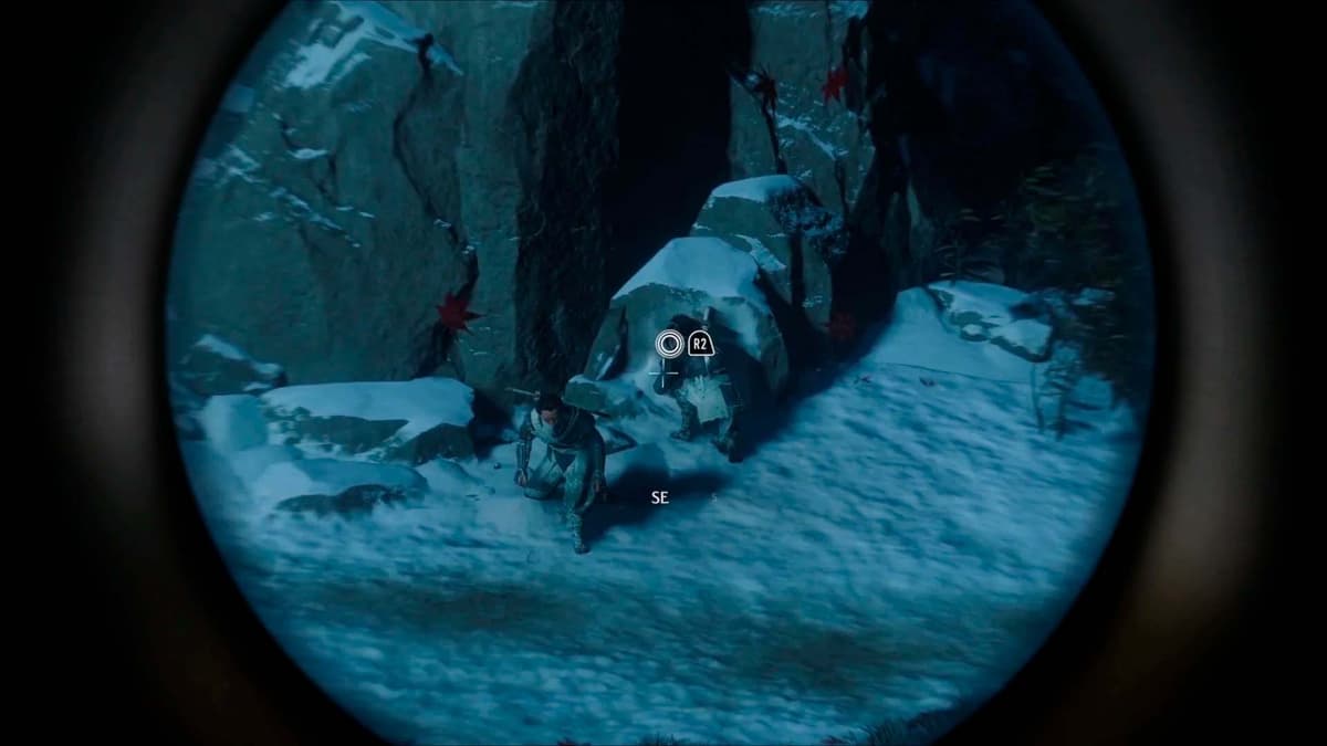 Ночью к святилищу наконец заявляются трое синоби Девяти Хвостов за подношением. Они останавливаются у валуна, рядом с которым лежали деньги. Тебе подсказывают снова воспользоваться подзорной трубой (нажми вверх). Наведи взгляд на того, кто присел у камня, и нажми R2.