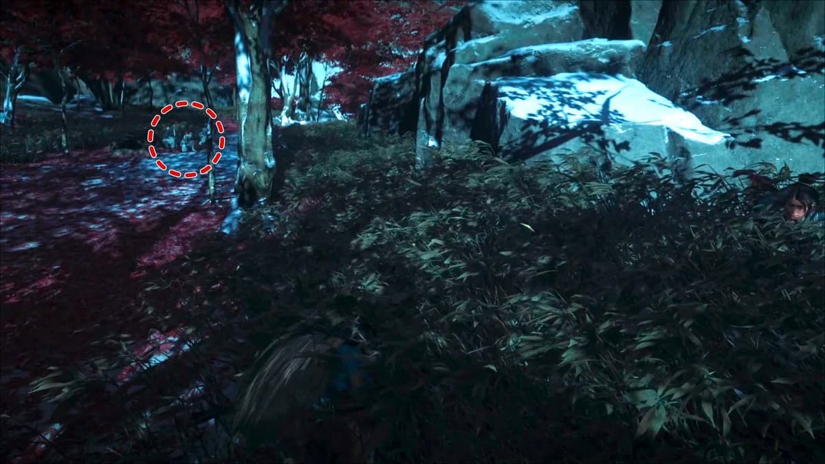 Держись в режиме скрытности и следуй за врагами, прячась в высокой траве. Не подходи слишком близко. Вскоре синоби остановятся у ещё одной метки на маршруте, а затем разделятся. Ацу решает преследовать того, кто ушёл по левой тропе.