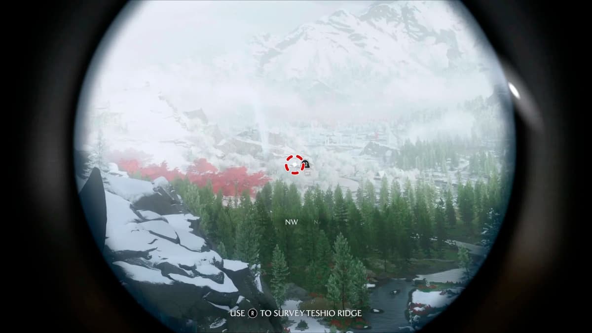 Как только выберешься из пещеры после миссии «Духи хребта Тесио», осмотрись с помощью подзорной трубы (нажми вверх на крестовине). Повернись на северо-запад и найди метку на стыке белых снежных полей и красно-зелёного леса. Это и есть гостиница — Ацу решает, что лучше места для расспросов про Кицунэ не найти.