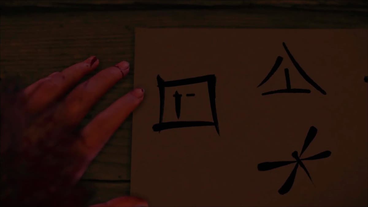 Осмотри центральную статую (она держит фонарь). Ацу замечает на ней странные символы – пока непонятно, что они значат. Но на основании центрального постамента изображены четыре значка, такие же есть под остальными лисами.