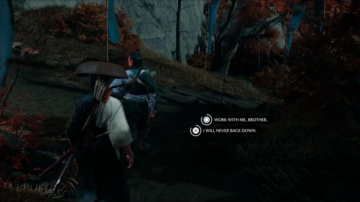 Когда бой стихнет, камера перенесётся к мосту — там Дзюбэй в беде. Скатывайся по каменной горке, перепрыгивай разлом крюком‑кошкой и беги вперёд — помогать брату.