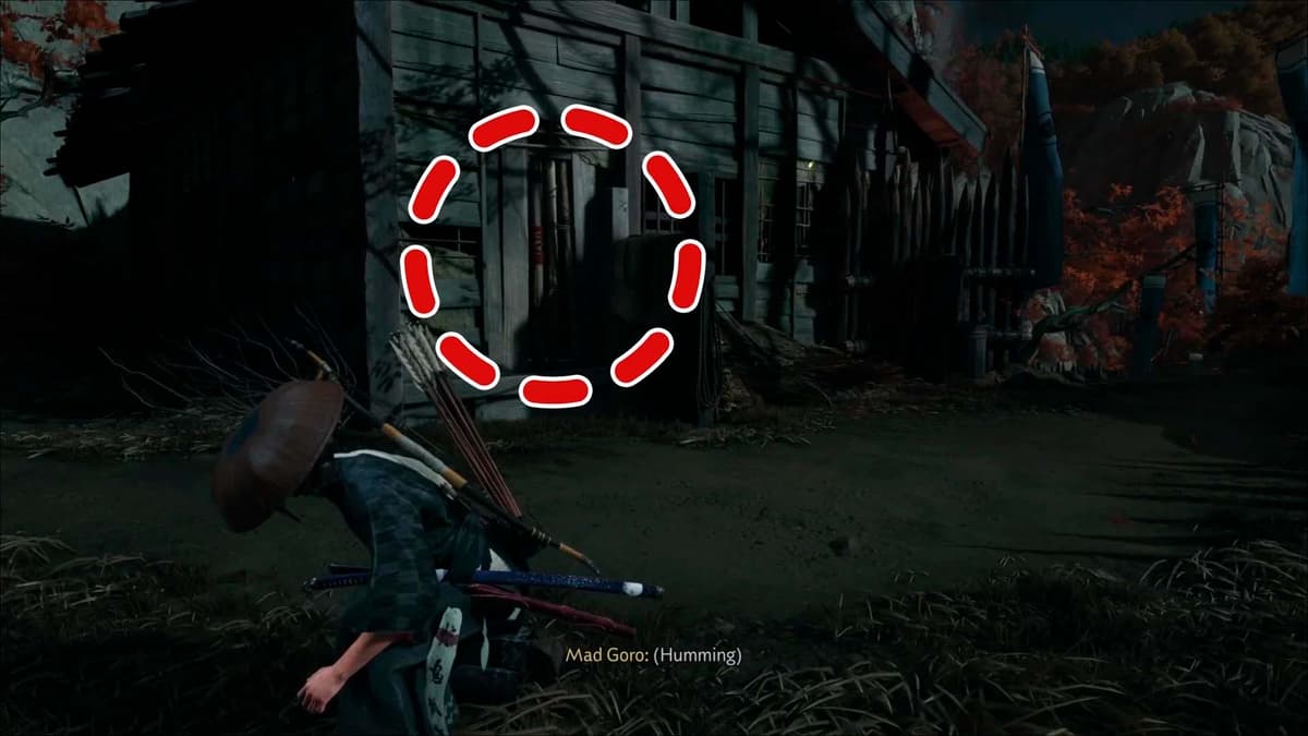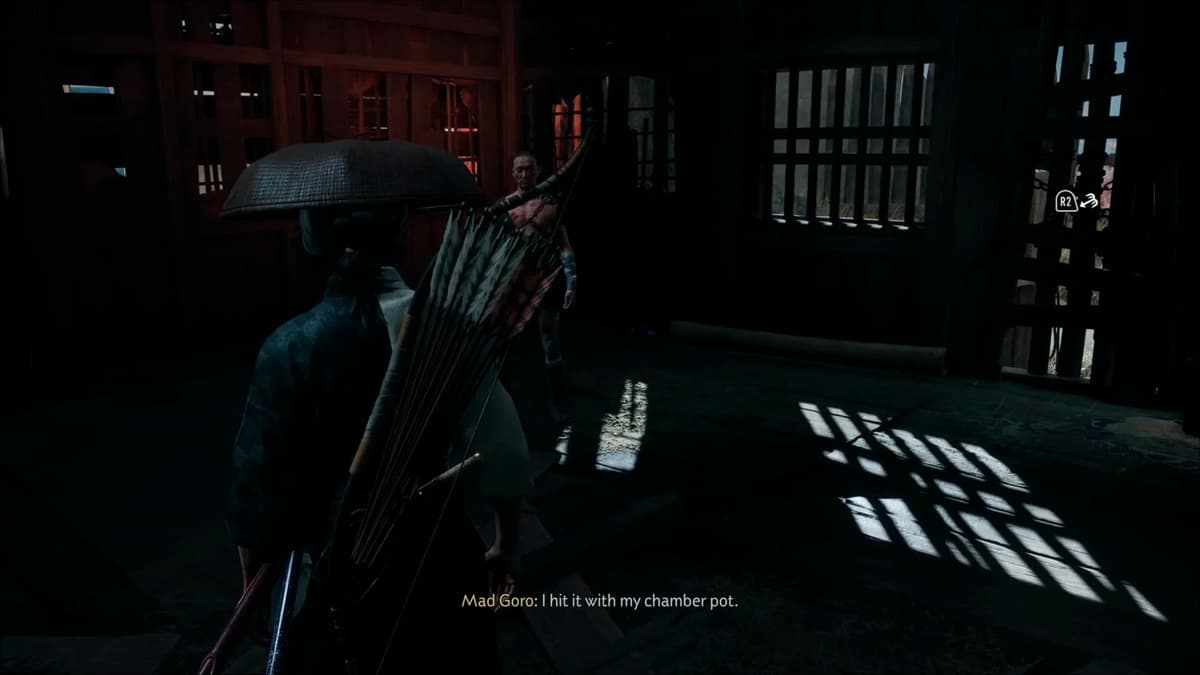 Держи бой на широкой дуге — так виднее подкаты яри, и меньше шанс поймать урон в спину. Когда стрелки Они на уступе начнут вести огонь, не лезь по прямой. Поднимись по лестнице у шатра, подними щит и нанеси два быстрых удара. Убедись, что площадка действительно пустая: часто остаётся один лучник за стойкой с лампами — если не убьёшь его, следующая сцена не начнётся.