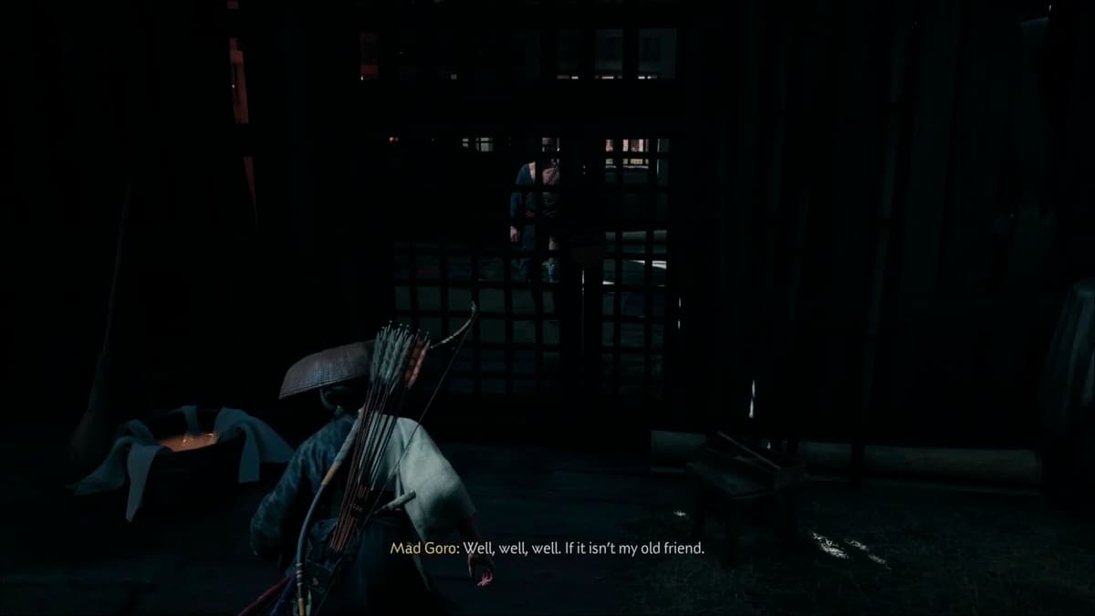 Пролезай в щель — стартует кат‑сцена: Дзюбэй пришёл проверить узника, и твоё появление его не удивляет.