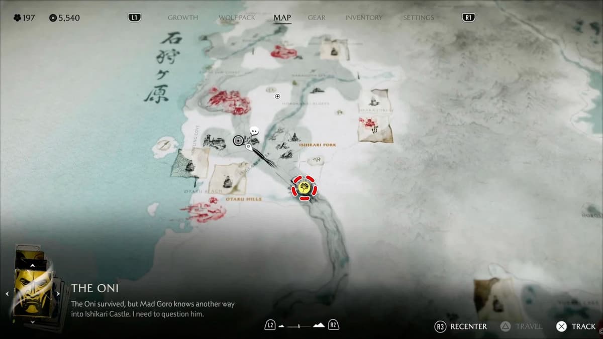 Замок Они — конечная цель арки. Он виден с плато над рекой, но путь сейчас завален: мост взорван, лагерь в руинах, союзники рассыпаны по северным стоянкам. По сюжету сначала собираешь информацию у выживших Мацумаэ и ищешь следы Горо, затем возвращаешься к плану штурмовать крепость.