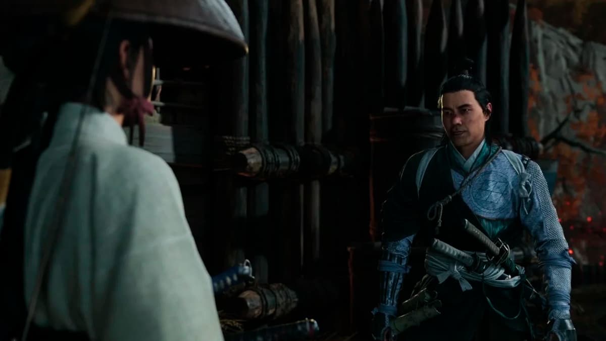 Осмотрись: в углу лежат сумка с порохом и моток верёвки — пригодятся у моста. За дверью есть узкий лаз между стойкой с копьями и бочкой; в момент тревоги он спасает, туда даже рейдер с яри не пролезет. Если выберешь реплику про «щедрость», Дзюбэй заметно смягчится в следующем диалоге и не будет спорить с твоим планом.