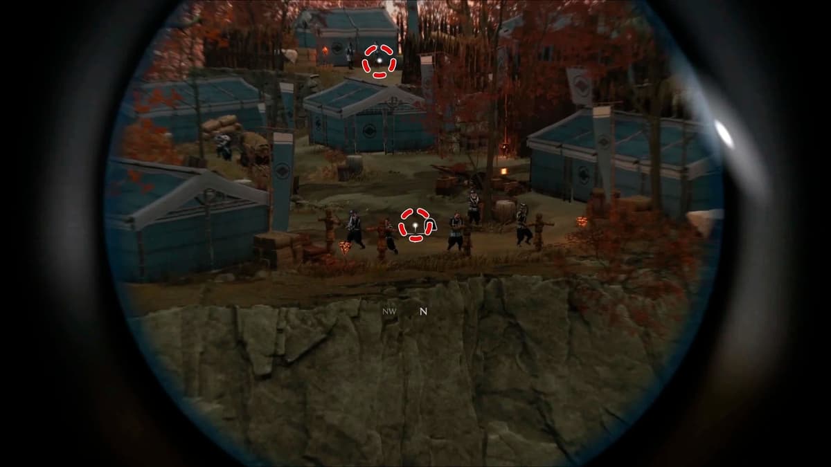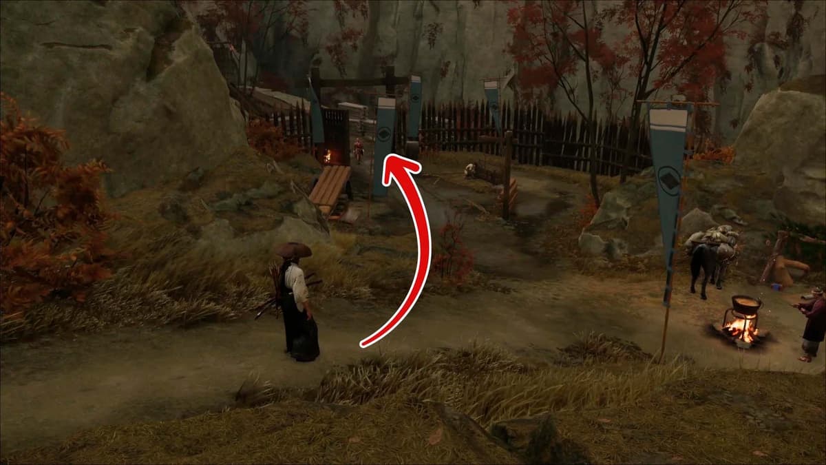 По пути проверь снаряжение: возьми масло, пару дымовых бомб, лечебные настойки. Около ворот есть алтарь — восстанови стойкость и дыхание, так серия атак держится дольше, а из огня выходишь быстрее. Вокруг лагеря ходят двойные патрули по периметру с остановками у вышек. Лучше пропускать их. Если всё‑таки началась тревога, спрячься под мост, пересиди волну и вернись к плану.