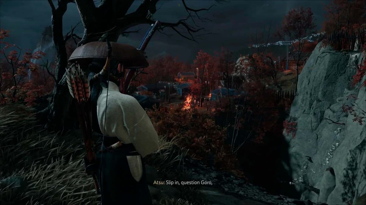 Спустись по верёвке и проследи за конвоем: Горо ведут к сараю на краю лагеря. Если хочешь пройти совсем чисто, дождись, когда конвой «распадётся» у костра. Левый страж отходит греться — этого окна хватает. Затащи тело в траву, не оставляй силуэтов у света — лучники могут заметить. План — дождаться темноты, потом ползком к пролому и прямиком к клетке.
