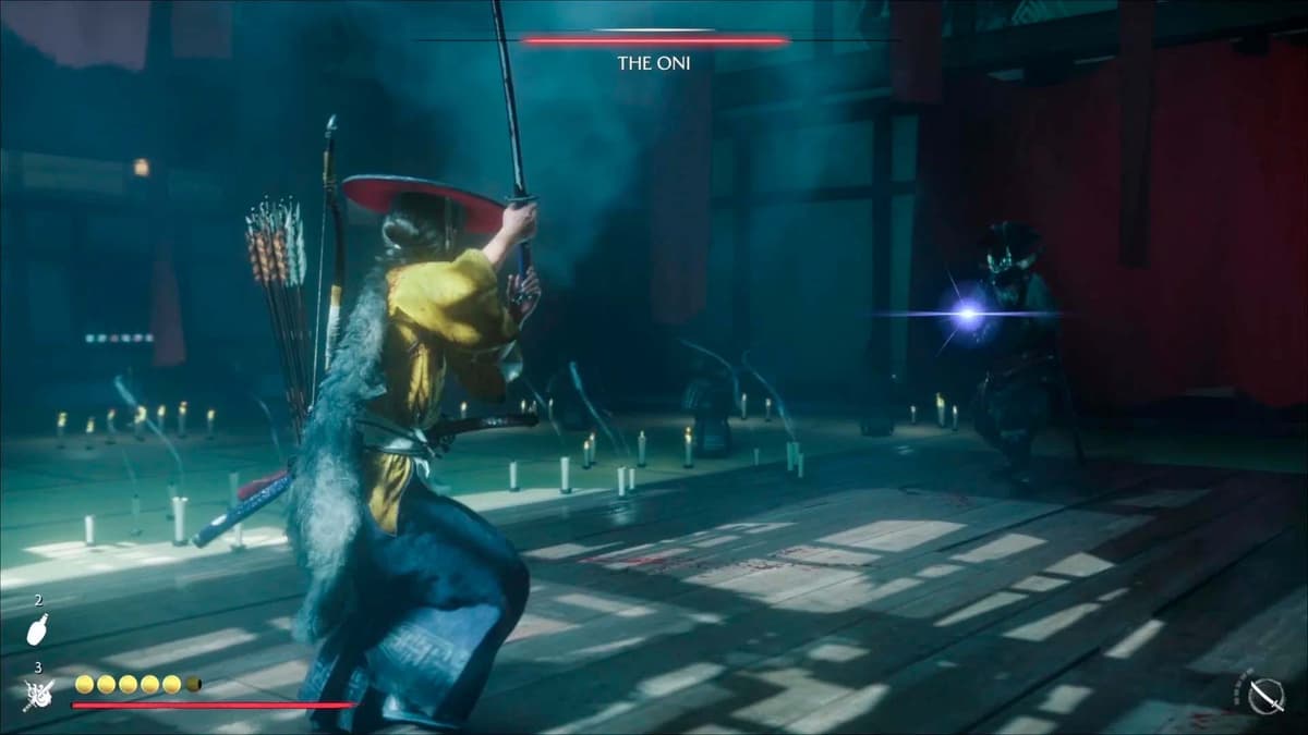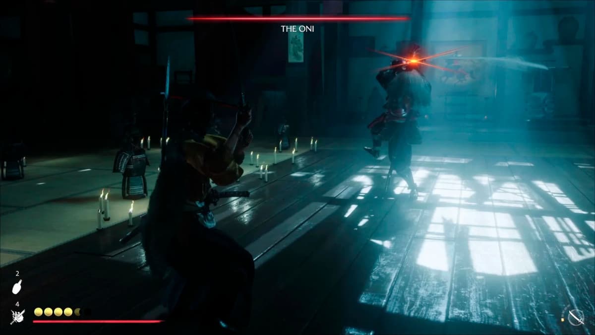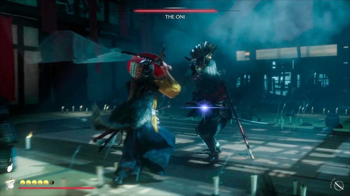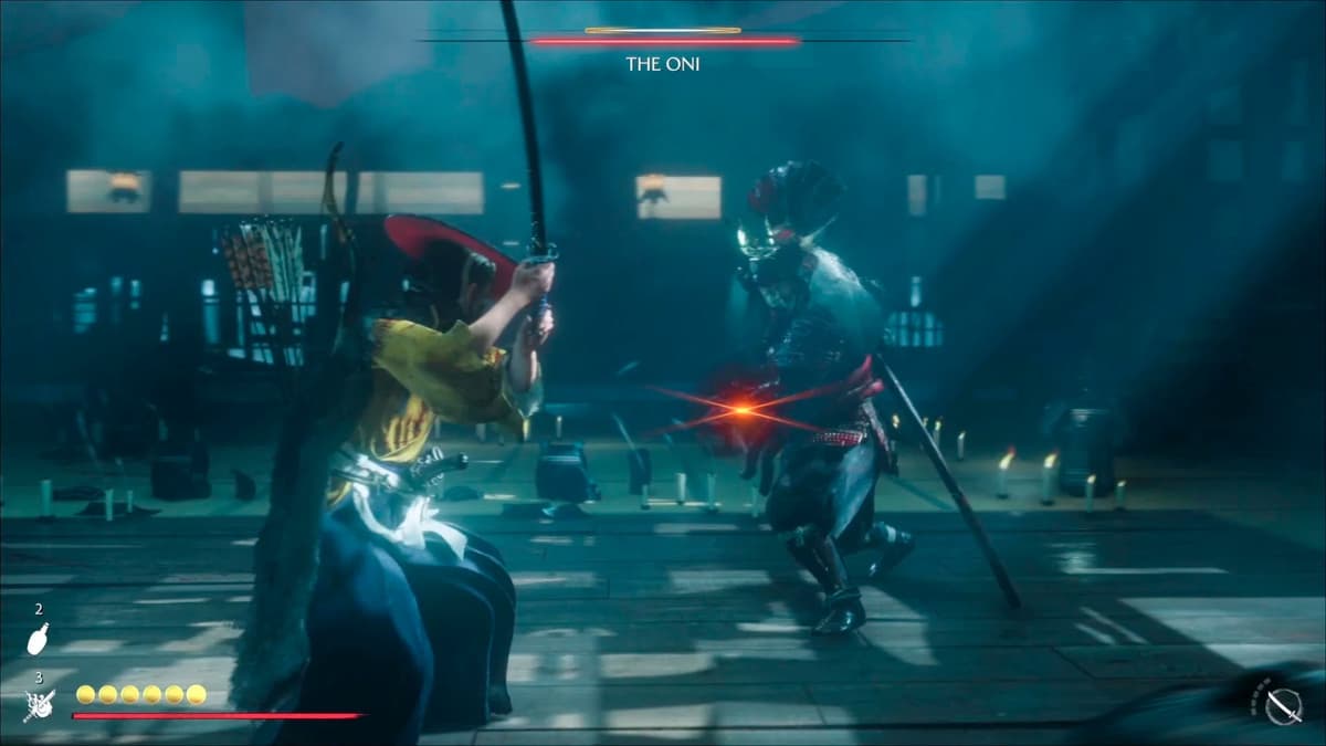 За дверью — зал сокровищ и сам Они. Короткий обмен фразами — и дуэль начинается. Это двухфазная схватка, одна из самых жёстких в игре. У противника одати — огромный клинок с большей дальностью, чем у твоей катаны. Если кажется, что он «не достанет», будь уверен – он достанет.