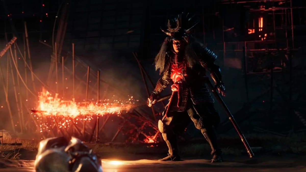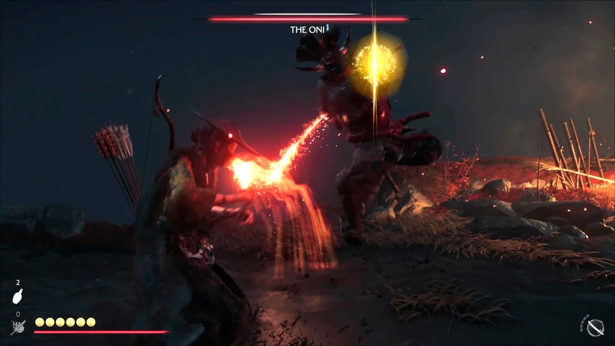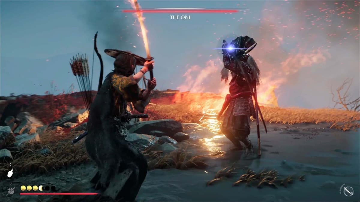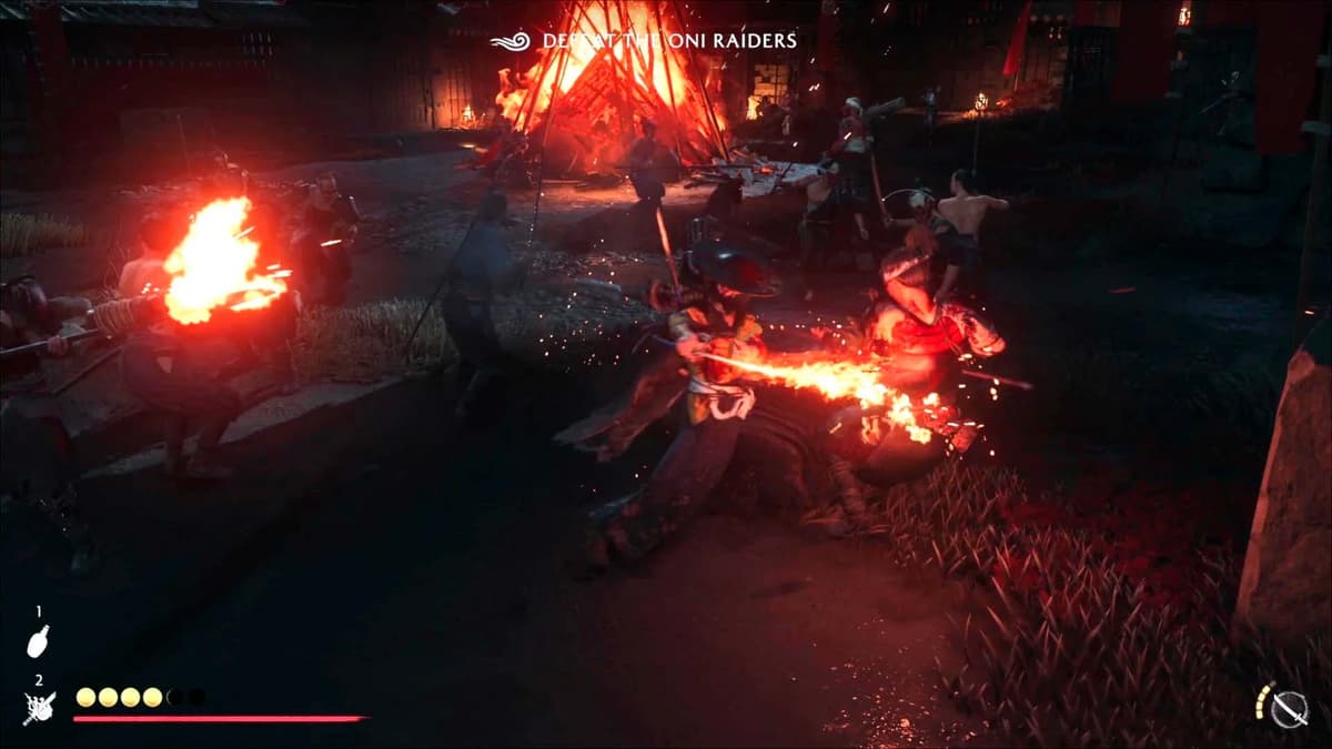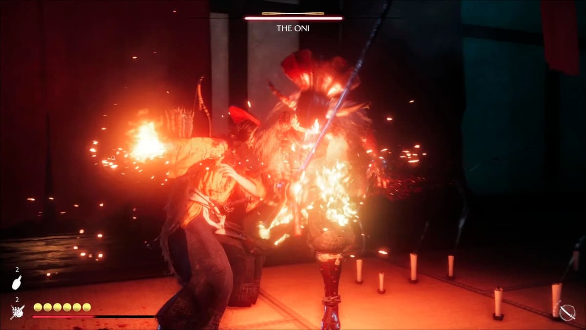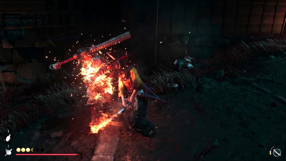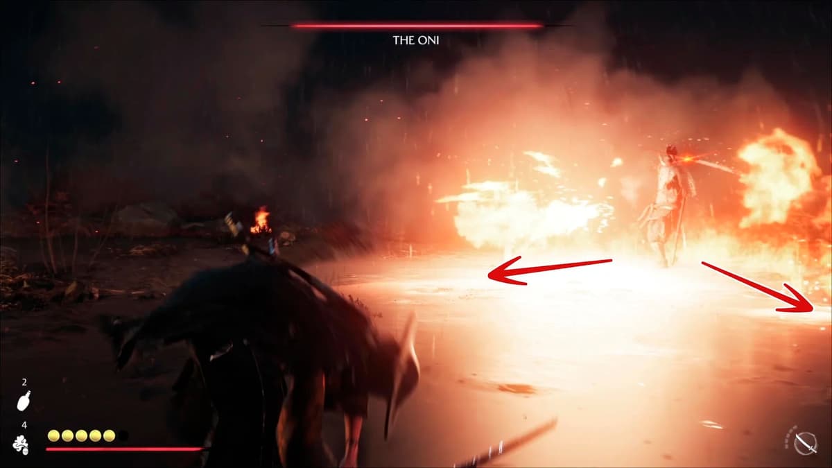 Босс поджигает одати. Пока меч горит, любые попадания накладывают горение. Если у тебя открыта техника «Кувырок с тушением», сразу делай перекат, чтобы сбить дебафф. Огонь гаснет сам, но Они время от времени разжигает клинок заново. Не стой у стен — там плохо видно момент удара.