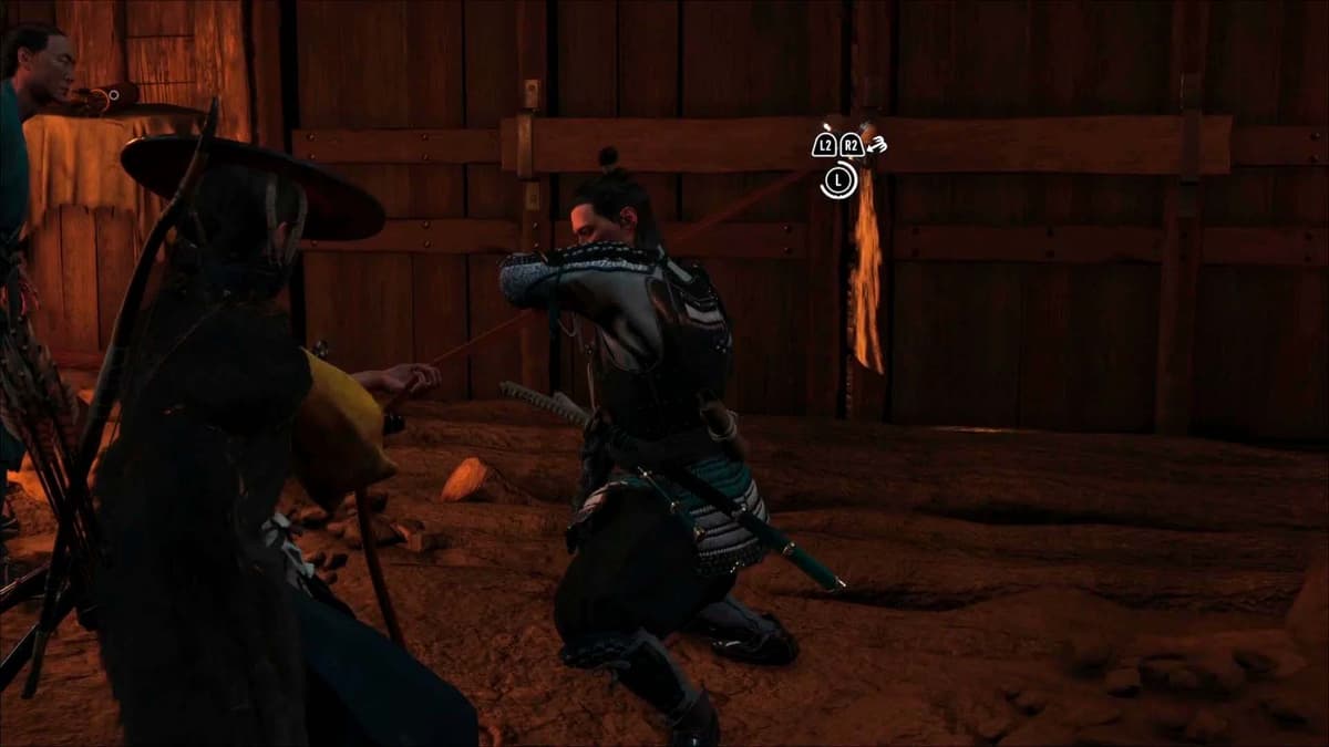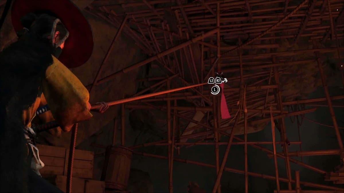 Жми L2 +R2, чтобы вытянуть Дзюбэя. Сними гнилую бамбуковую перемычку крюком, расчисти путь. Продвигайся к выходу — и вскоре вы вдыхаете свежий воздух.