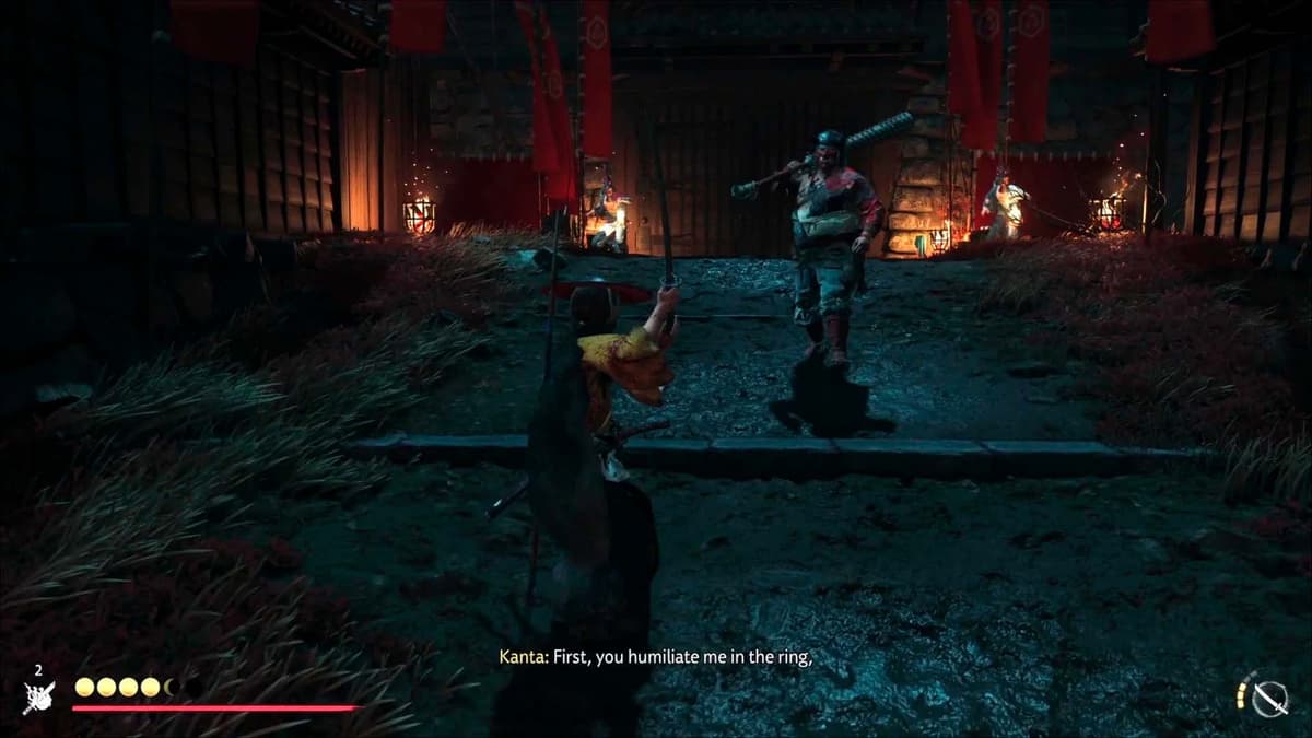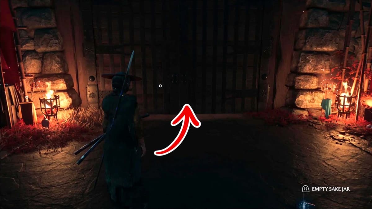 Канта падает быстро. Забери большой сундук у костра, вернись к воротам, которые он охранял. Рядом лежат масло, сакэ, стрелы — пополни боезапас, и вперёд: следующая дверь ведёт прямо в логово босса.