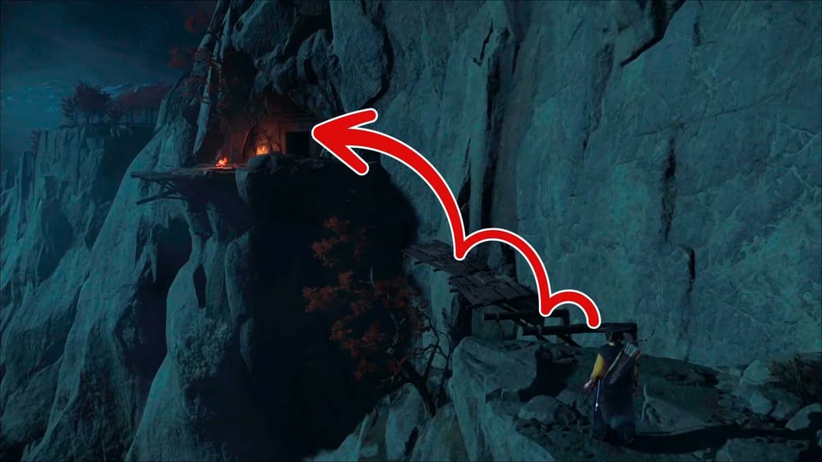 Сделай пару шагов и поверни направо: серия деревянных платформ и балок ведёт вверх. Наверху — новая ниша в скале. Если пойдёшь налево от первой площадки, найдёшь тайник с рудой и лечебной травой — пригодится перед штурмом.