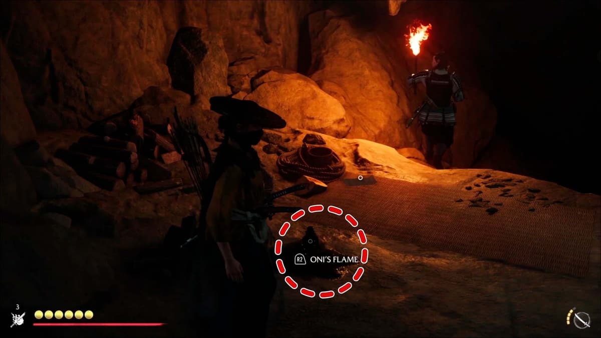 Осторожно: на карнизе патрулирует рейдер Они. Убери его тихо или проскочи в пещеру. Рядом в лагере валяются бутылки сакэ — готовь для отвлечения. Внутри пещеры справа на стене — стрелы. На повороте налево — большой сундук. Забирай и двигай дальше: это уже подземелья замка.