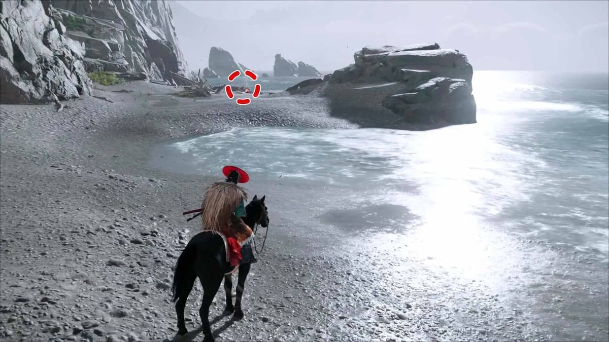 На плато увидишь спуск к пляжу. Можно съехать по склону или прыгнуть на точку для крюка‑кошки — оба варианта хороши. Внизу — костёр и Дзюбэй. Подойди, поговори — миссия стартует.