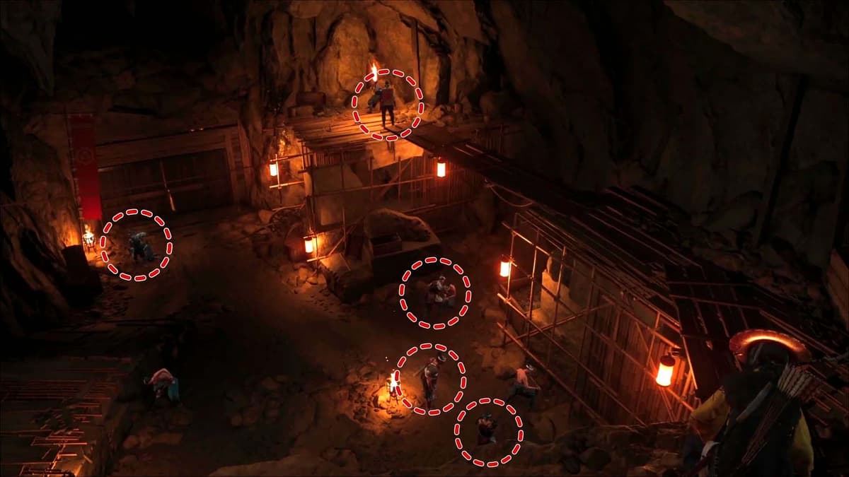В просторном зале рейдеры Они гонят самураев клана Мацумаэ чинить стены. Здесь удобнее работать сверху и убивать их по одному. Тишина — твой лучший друг.