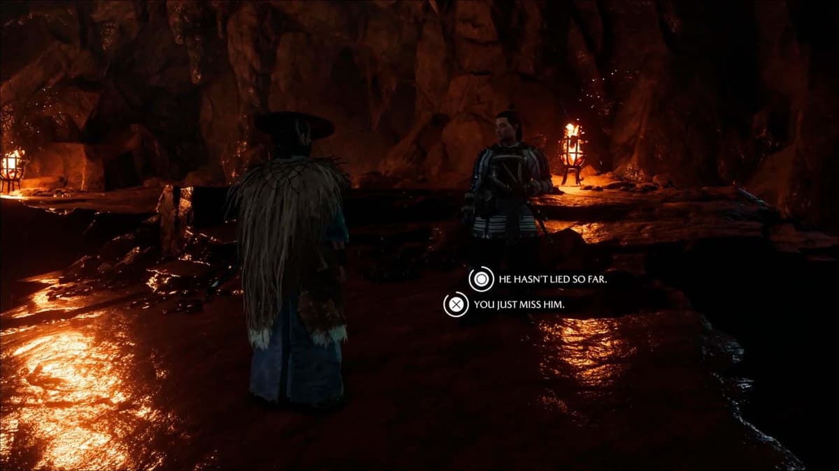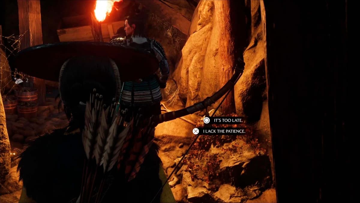 Короткая сцена: близнецы остаются ждать до ночи, проговаривают боль и восстанавливают силы. Затем катсцена в лодке — и вы оказываетесь в скрытой шахте, ведущей к замку. Дзюбэй подшучивает про Безумного Горо — игра просит выбрать реплику: