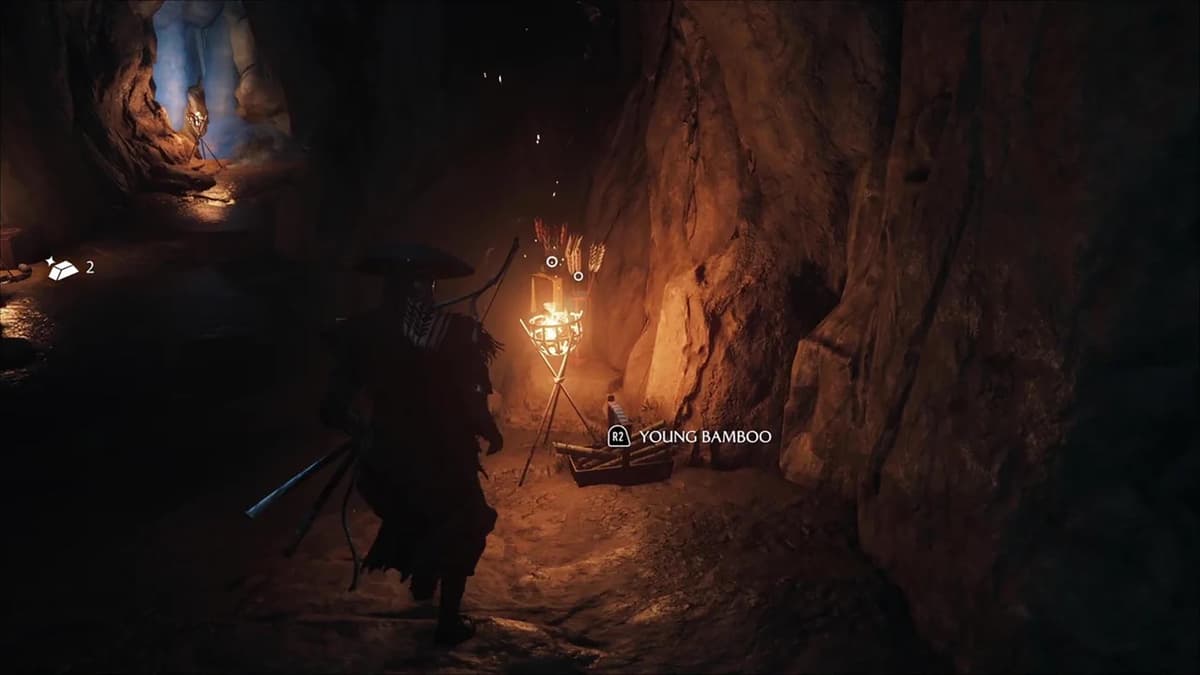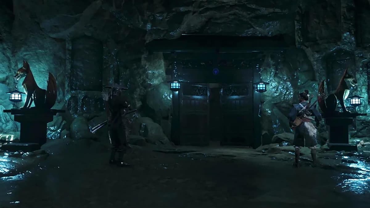 Просто так пробраться в логово врагов не выйдет — для начала нужно решить пазл. Обрати внимание на статуи лис, держащих жаровни по обеим сторонам от двери.