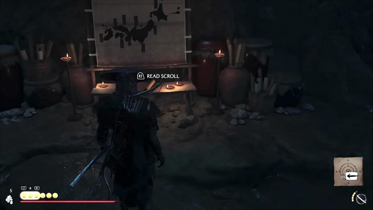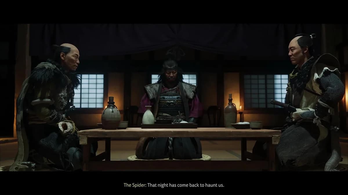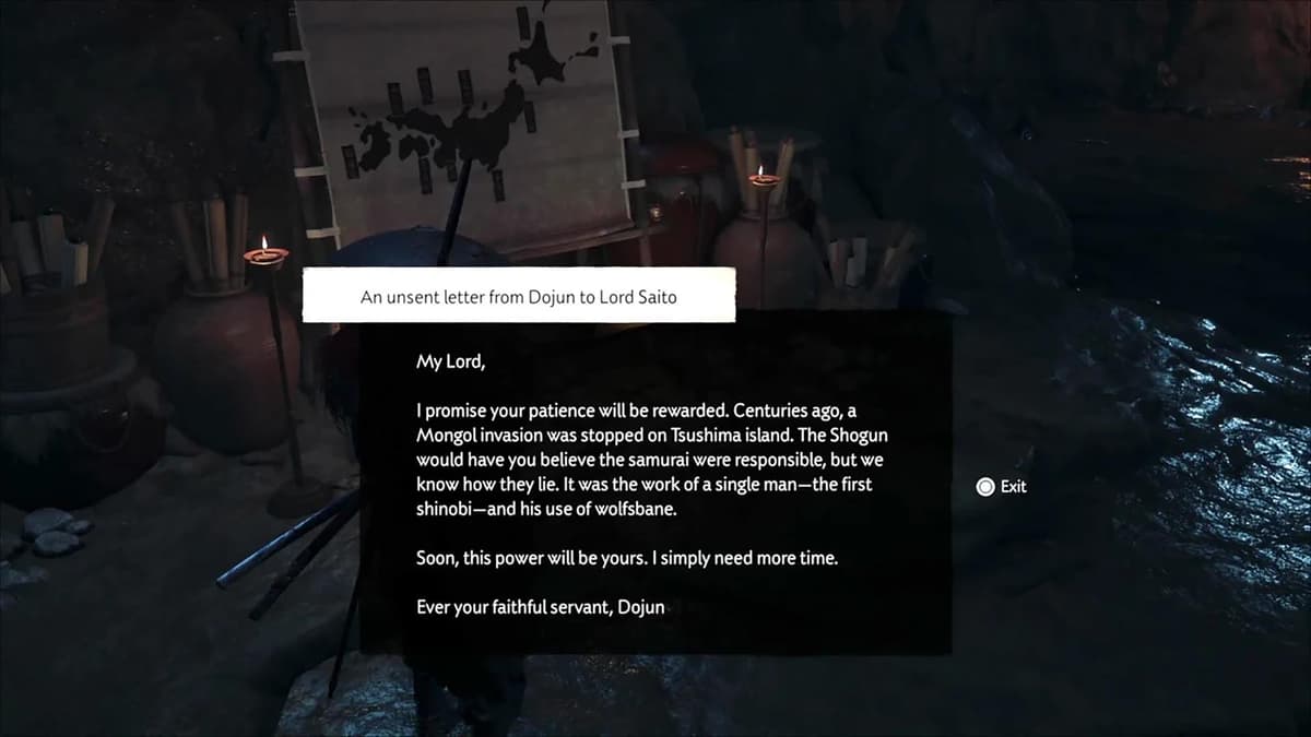 После этого иди к Оюки — она ждёт у карты в центре комнаты, на которой обозначена целая шпионская сеть, окутавшая регион. Здесь же ты можешь найти свиток с письмом Додзюна к Сайто. В нём он говорит о загадочном синоби, который остановил монгольское вторжение на Цусиме — явная отсылка к предыдущей игре.