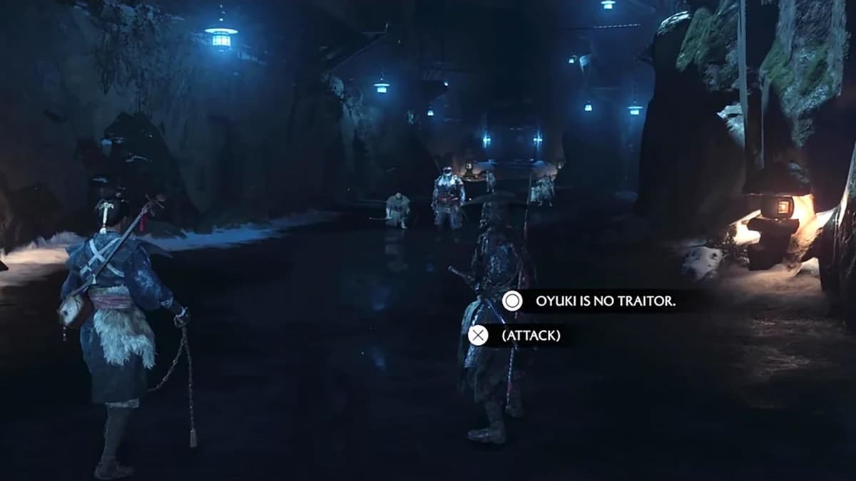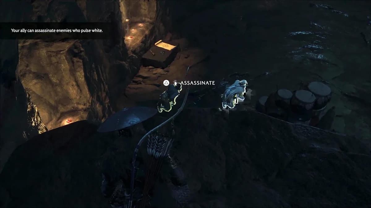 Спустись вниз и налево, чтобы попасть на выступ над двумя бойцами. Ты здесь не один, поэтому получится провести парное скрытное добивание с Оюки.