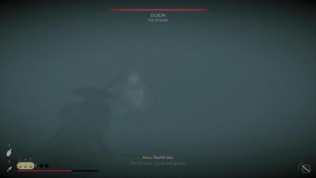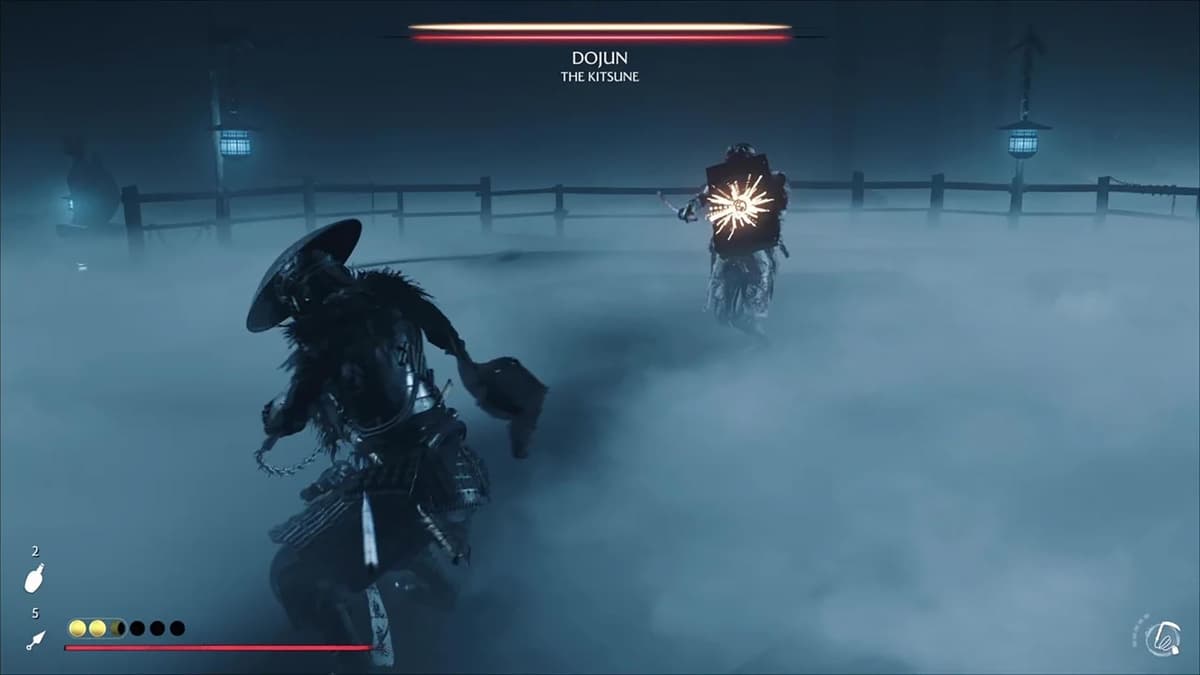 Когда он получит достаточно урона, босс кинет дымовую шашку. Используй R3, чтобы найти его, и быстро нажимай блок, чтобы блокировать его атаки.