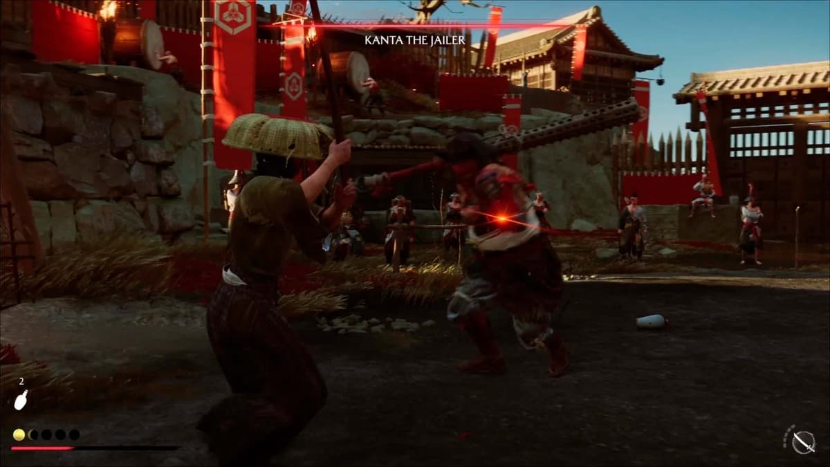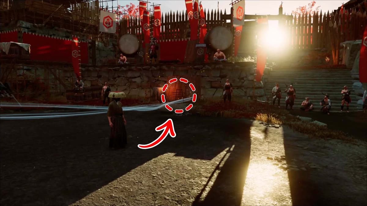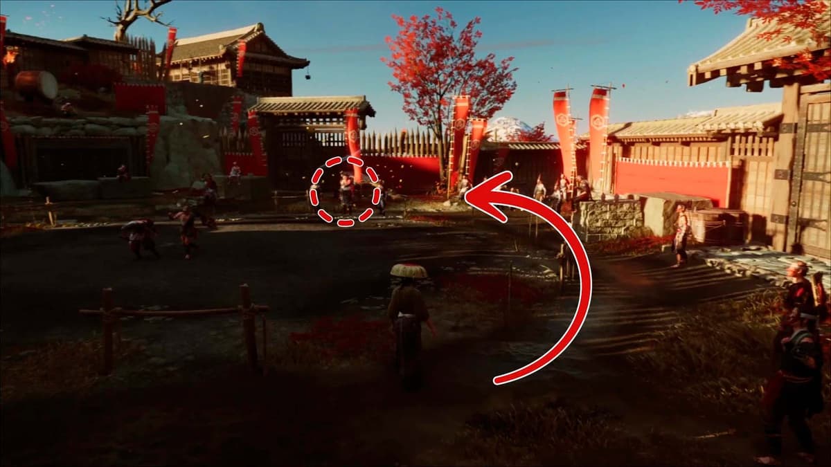 На плите у красного флажка лежит пустая бутыль из‑под сакэ — забери. Чуть дальше двое стражников издеваются над пленником. Кинь бутыль, отвлеки ближнего — и тихо выруби. Второго — следом.