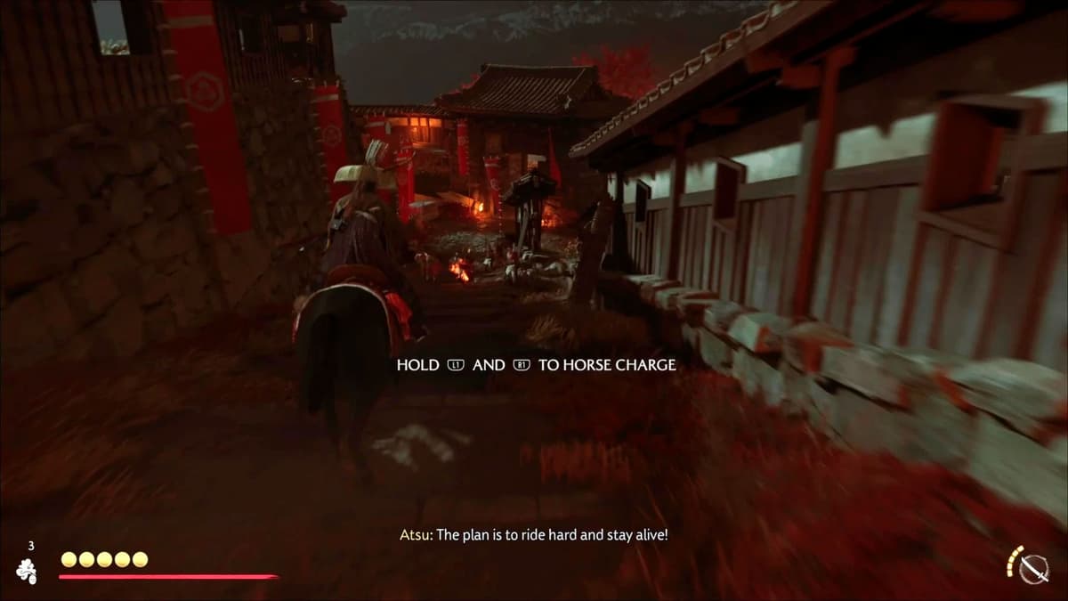 Следуй за Дзюбэем к конюшням и садись на коня. На пути встанет толпа врагов — игра обучит приёму «Конный таран»: зажми L1 и R1 и мчи напрямик, сбивая противников.