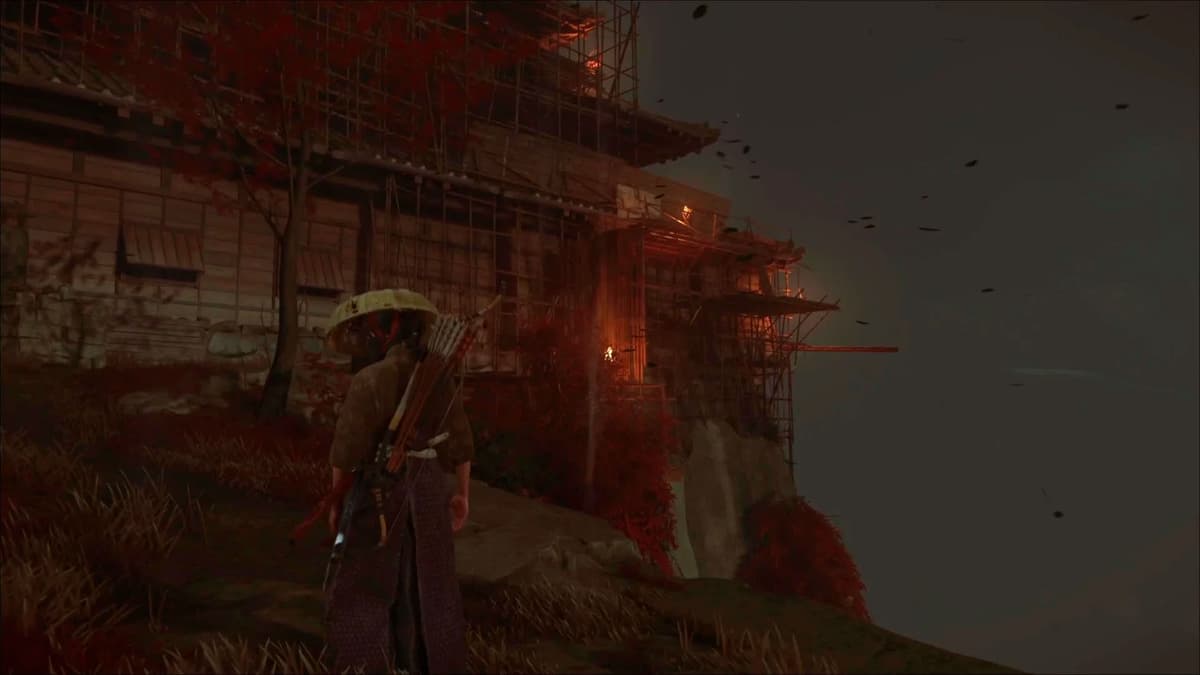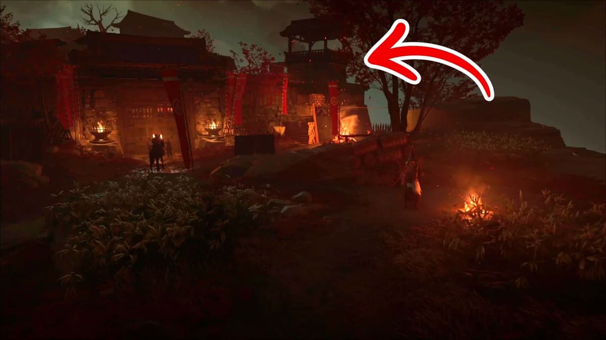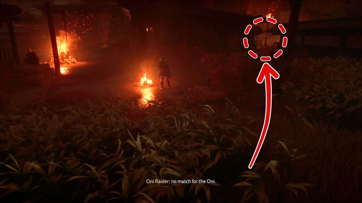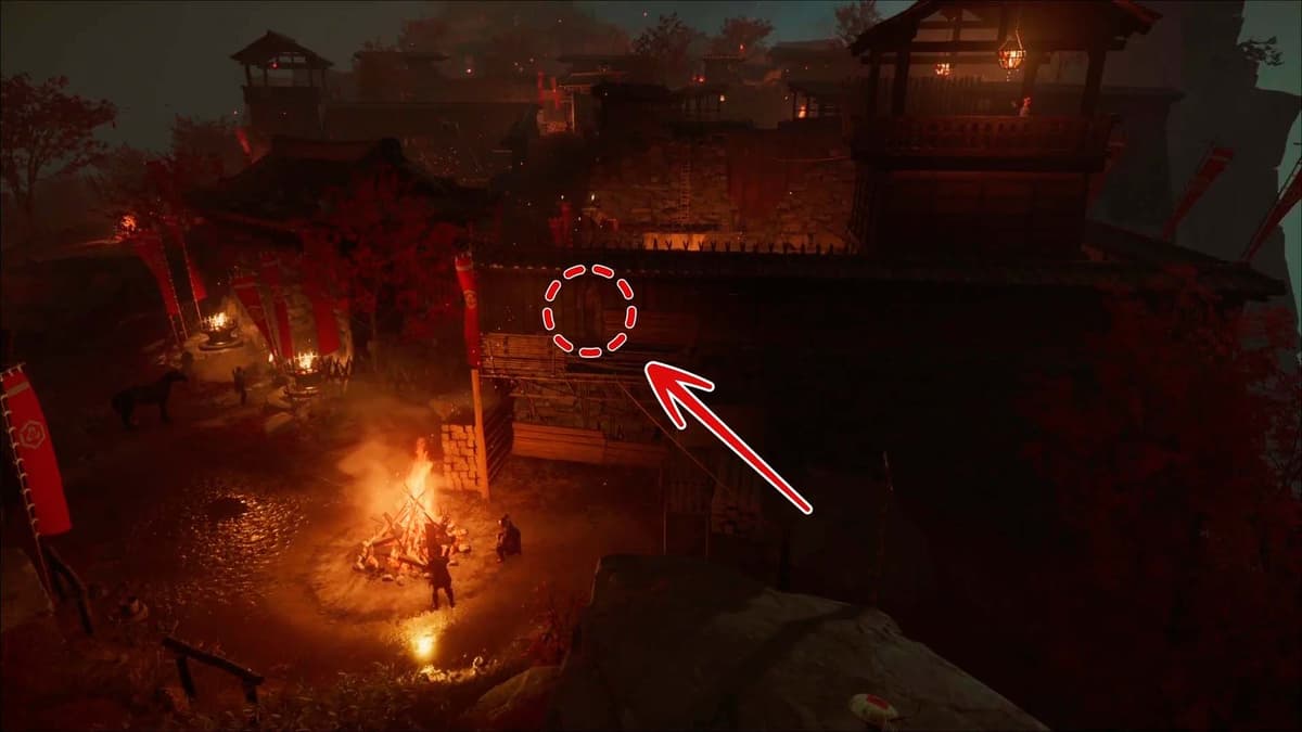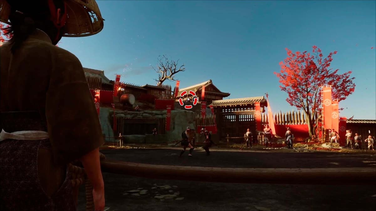 Подними камеру к зданию за ареной и поймай белую точку. Зажми R2, чтобы приблизить: видишь, как узника привязывают к столбу. Ранее Они велел выставить у темниц тело — значит, Дзюбэй где‑то рядом.