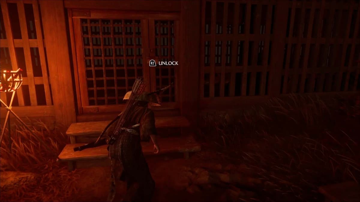 Когда окажешься рядом с клетками, глянь направо — там ещё одна дыра в стене. Пролезай и двигайся к большому зданию за жаровней. Взаимодействуй с дверью — замок щёлкнет. Ацу и Дзюбэй наконец воссоединяются.